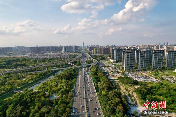8月20日,初秋的河南郑州上空蓝天白云,与市区的现代楼宇相映成趣,仿佛一幅高清的“动态壁纸”。图为蓝天白云下的郑州城区一角。(无人机照片)赵梦阳 摄