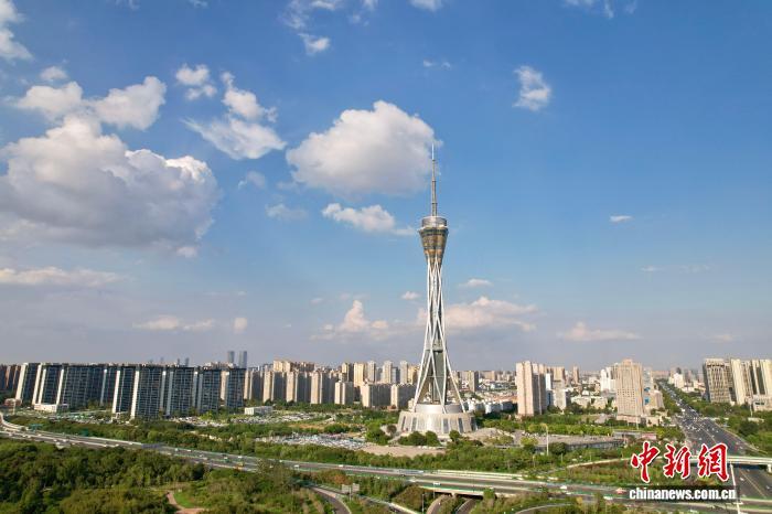 8月20日,初秋的河南郑州上空蓝天白云,与市区的现代楼宇相映成趣,仿佛一幅高清的“动态壁纸”。图为俯瞰郑州中原福塔。(无人机照片)赵梦阳 摄