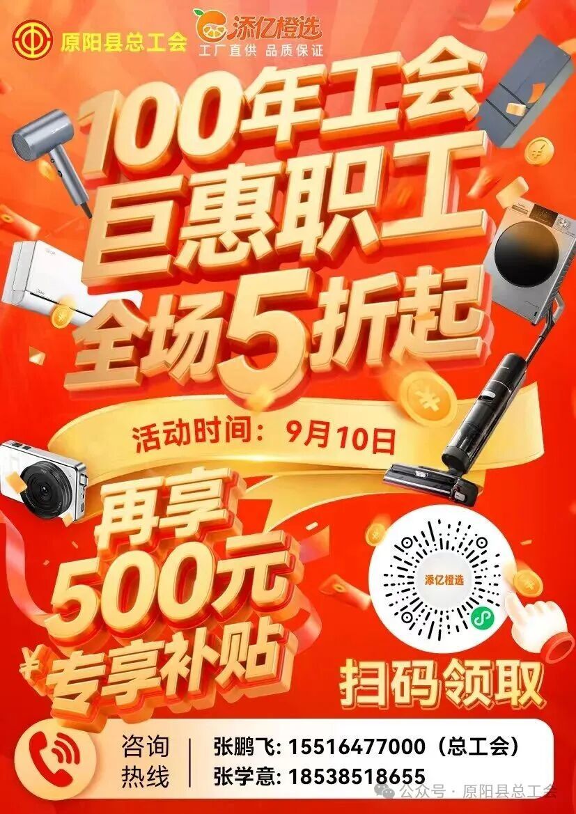 通知说,为庆祝中华全国总工会、河南省总工会成立100周年,深入贯彻落实国家促进消费政策,充分发挥工会组织服务职工职能,进一步促进职工消费、提升职工生活品质,增强工会会员的获得感、幸福感与荣誉感,原阳县总工会决定联合添亿橙选平台开展“情系职工·家电惠工”百万补贴优惠活动,让广大职工享受实实在在的福利。
