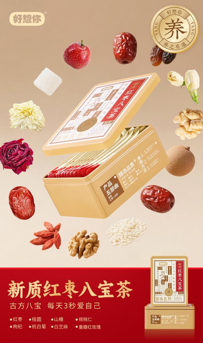 近两年,电解质饮料赛道火热,而好想你则用冻干“轻中药”理念,在电解质补给赛道实现了“弯道超车”,好想你八宝茶用冻干锁鲜把红枣、桂圆、枸杞、山楂等8种食药同源食材做成3秒即溶粉,每100g钾含量482mg,并实现了“冷热双冲、小包便携”。健康、方便的产品,切中了健身达人“运动后钾补给”,以及职场人“久坐疲劳都退散”的消费场景。