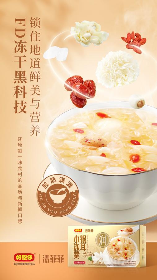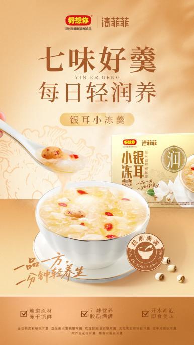 早已在声名远扬的好想你清菲菲系列,也上新了全新爆品“银耳小冻羹”,该系列7种口味,通过冻干技术把古田银耳、湘莲、兰州百合等产地食材做成 60 秒冲泡的“即食银耳羹”,并通过一品一方、一分钟轻养生的理念,让消费者健康管理不再受限制。
