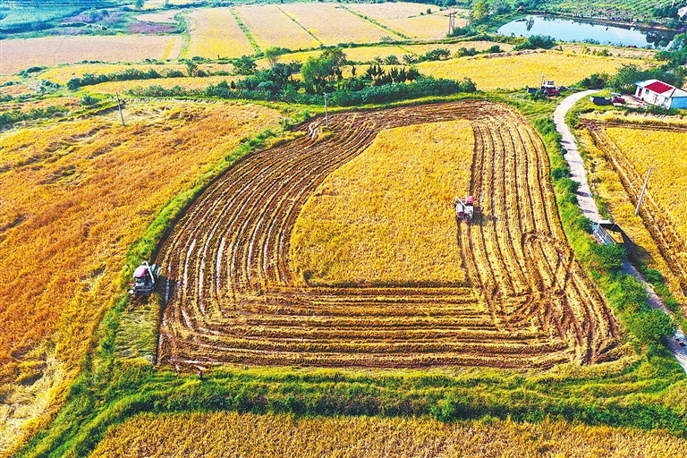 10月5日,在信阳市光山县正礼生态农业开发有限责任公司水稻种植基地,农民正在驾驶收割机抢收水稻。眼下,光山县天气放晴,当地农民抓紧有利天时抢收水稻并及时进行晾晒、储存。
