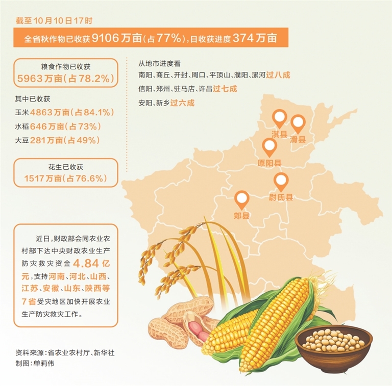 “‘三秋’工作启动以来,县里把抗阴雨、保秋收、稳麦播作为核心任务,启动日调度与日报制,调配新型履带式收割机、建成28个标准化粮食烘干点。同时,组建农业技术指导组分包到村,指导农户开展人工抢收。目前全县玉米已收获七成。”赵向辉介绍。(记者 王侠)