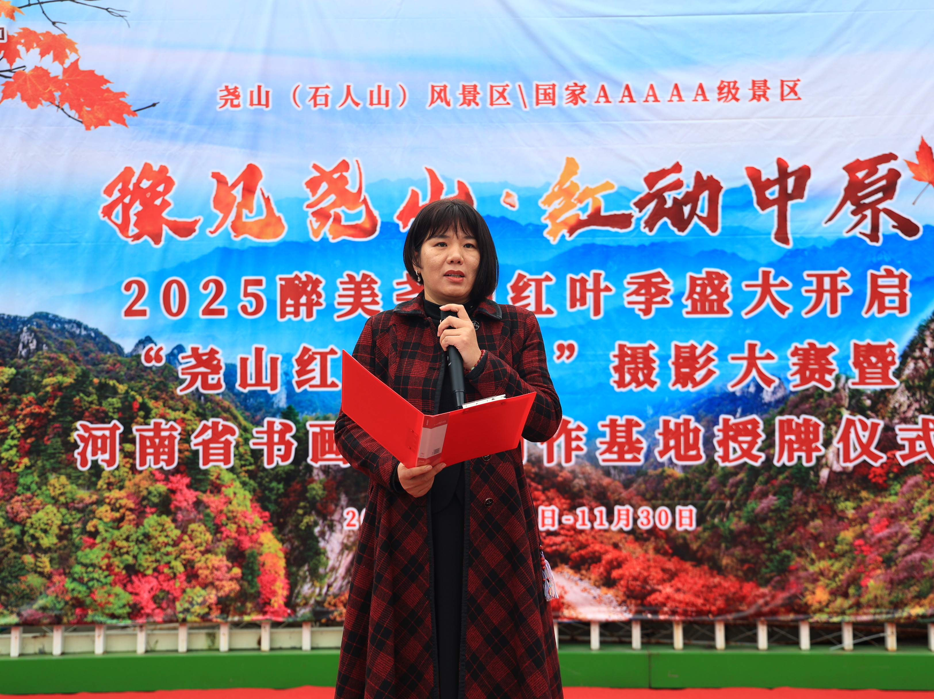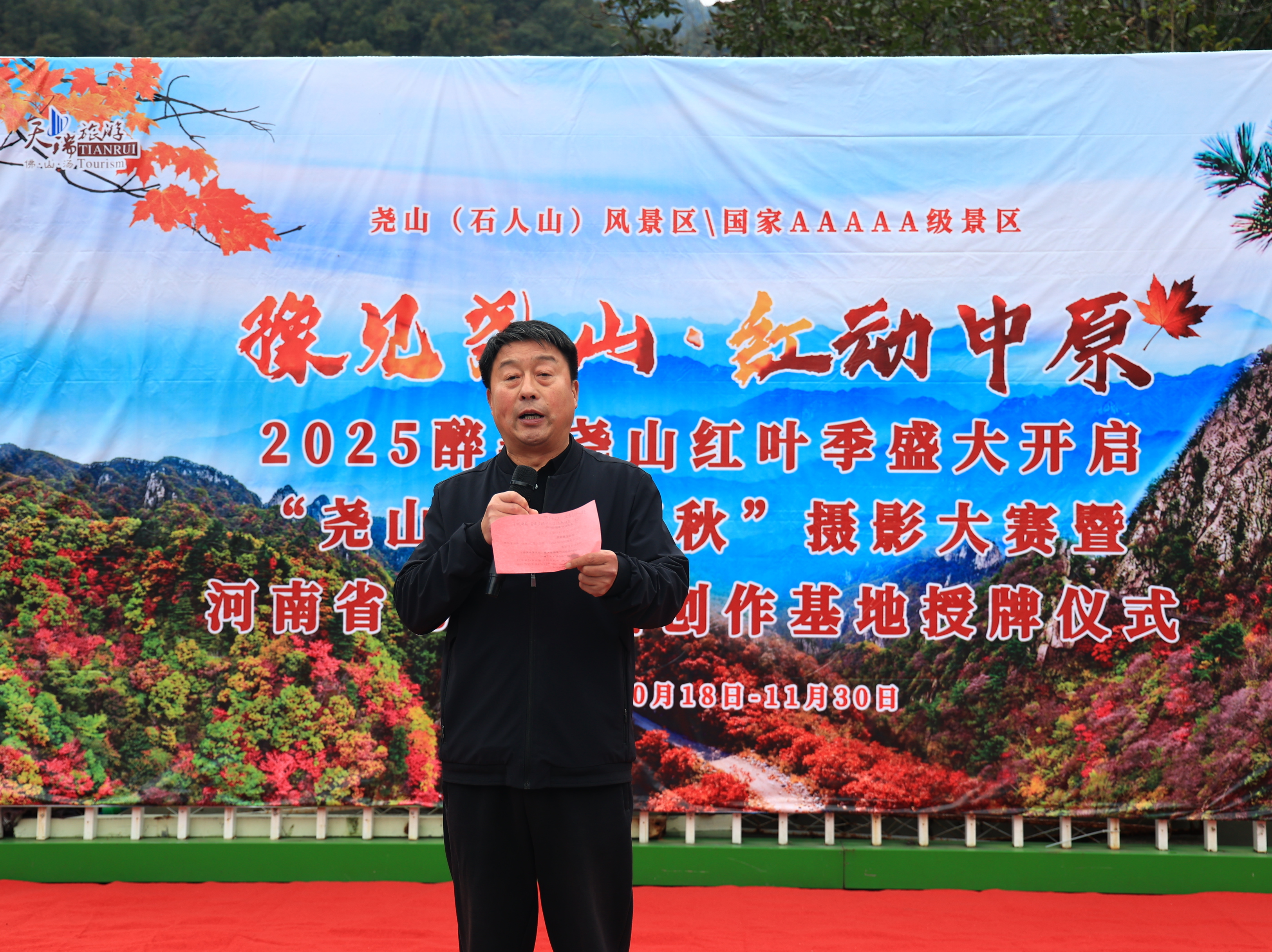 天瑞旅游集团尧山风景区常务副总经理张秀珍在致辞中说,秋天是尧山最美的季节,每逢金秋十月,尧山漫山红遍,层林尽染,红枫谷为观赏红叶最佳线路,3000米悠长峡谷内,五角枫、槭树、榉树、黄栌等“三黄五红十绿”,花团锦簇,如诗如画,美不胜收,走在其中,仿佛是“人在尧山走,身在画中游”,金秋红叶一相逢,便胜却人间无数。