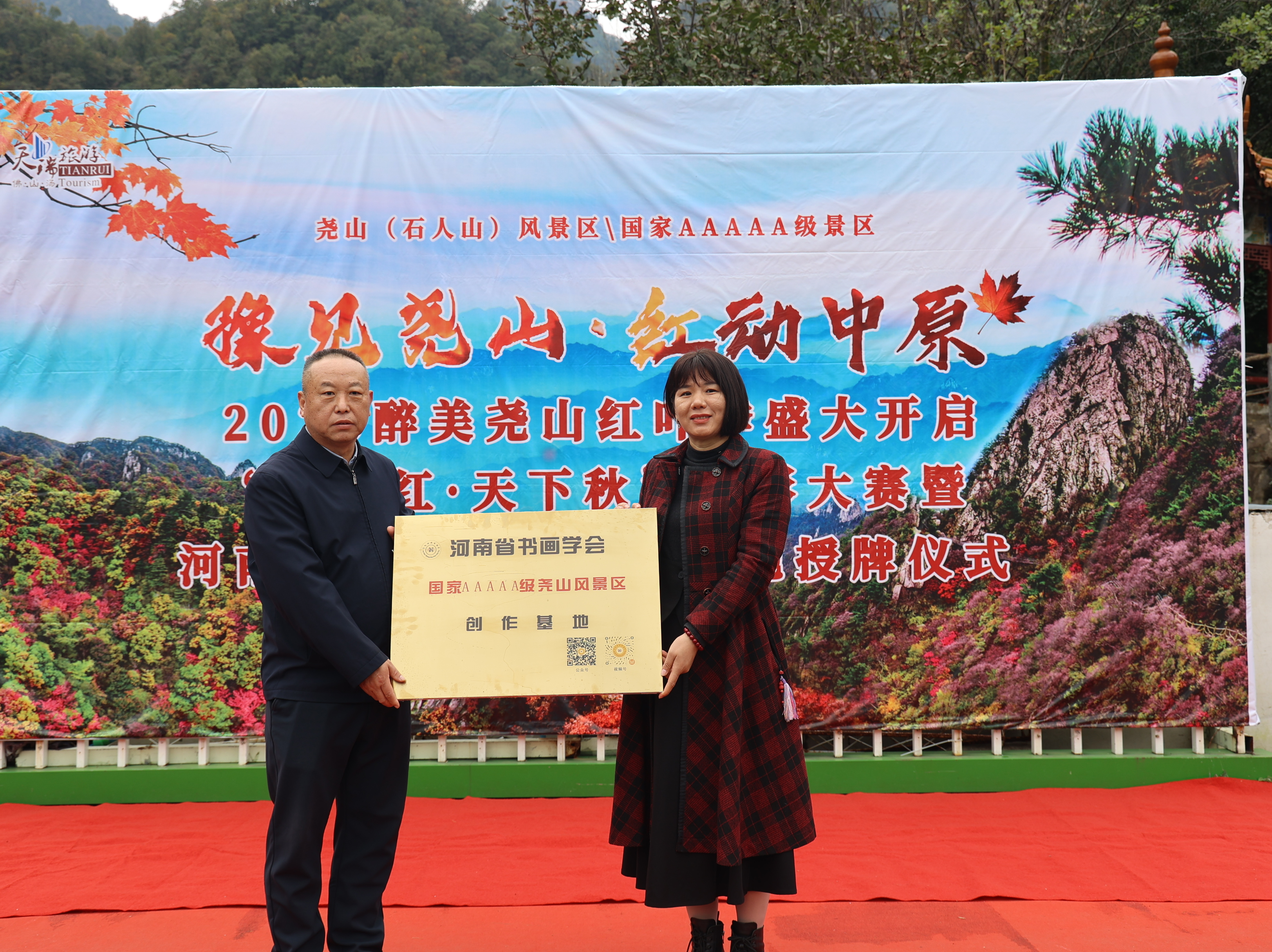 河南省书画学会主席徐秋月给尧山风景区授牌