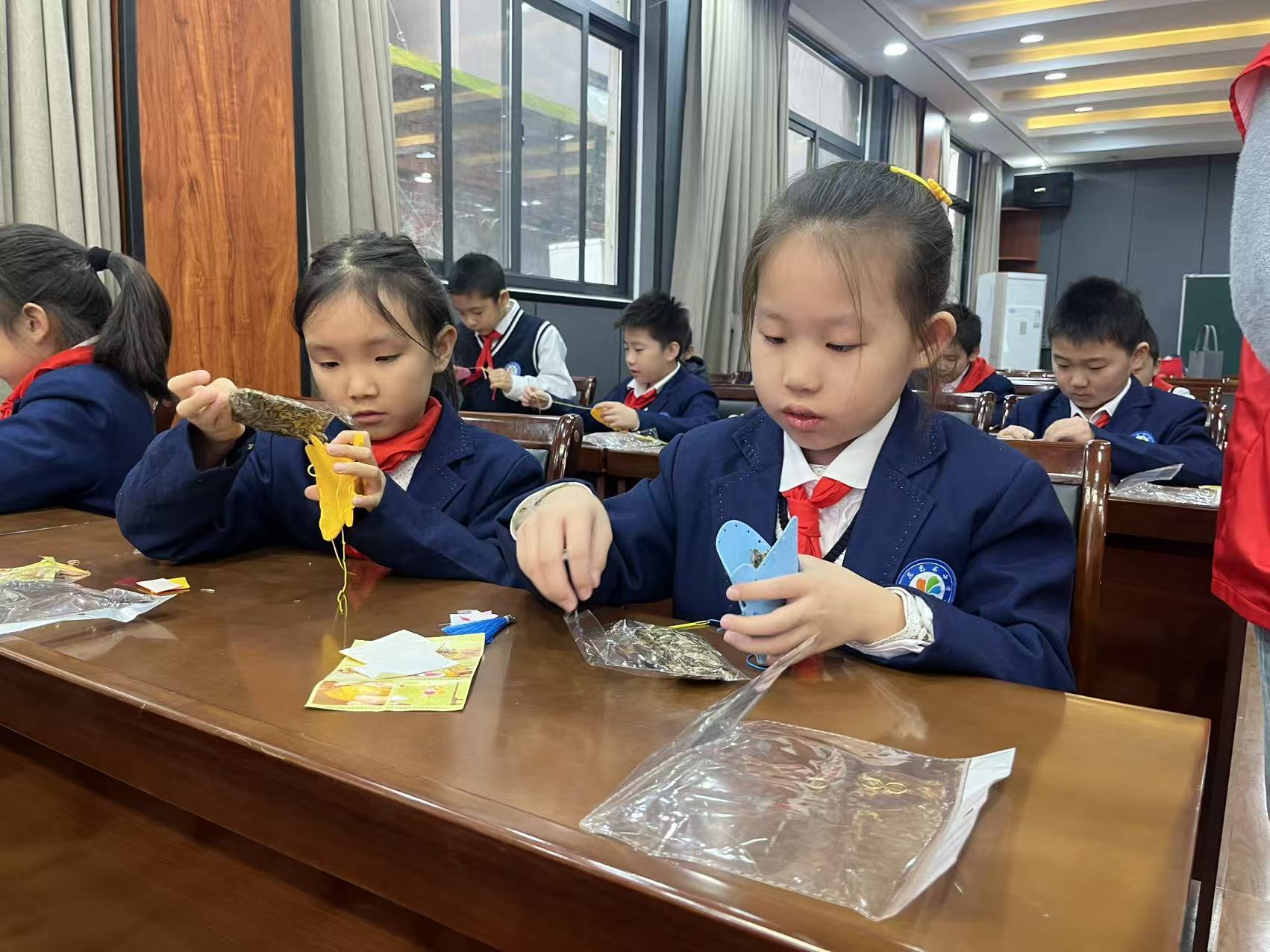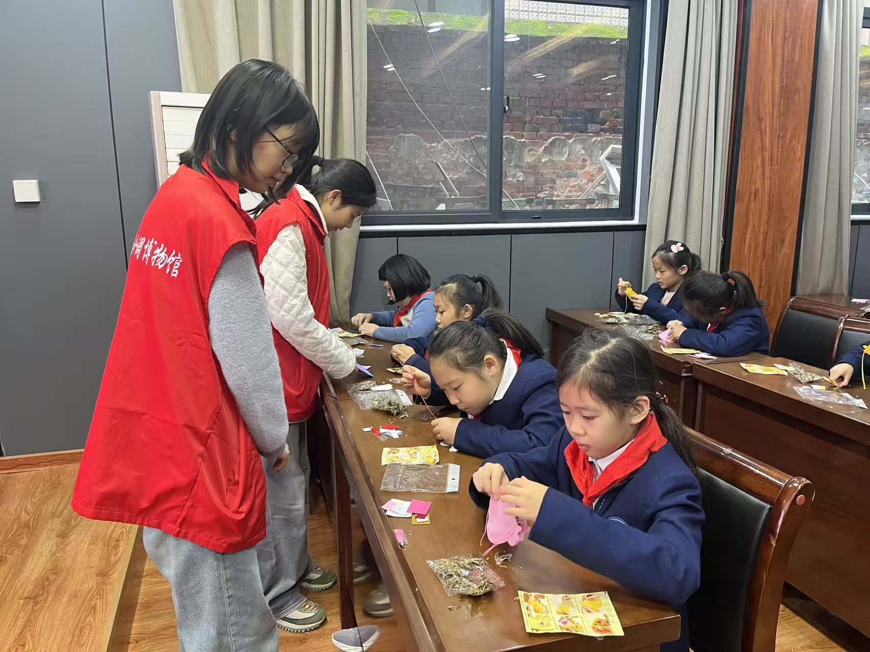 社教老师紧接着将提前备好的生肖香包材料分发给每位同学,大家瞬间被点燃热情,专注地穿针引线、填充香料,亲手打造专属的生肖香包,教室里的笑声与讨论声交织,满是热闹温馨的氛围。这一环节既是“动手课堂”,也是“文化课堂”,同学们在制作中强化了实践与专注能力,在趣味体验中学习、感悟,更顺着十二生肖的文化根系不断探寻,最终实现了从神话到历史、从信仰到艺术的完整认知跨越。