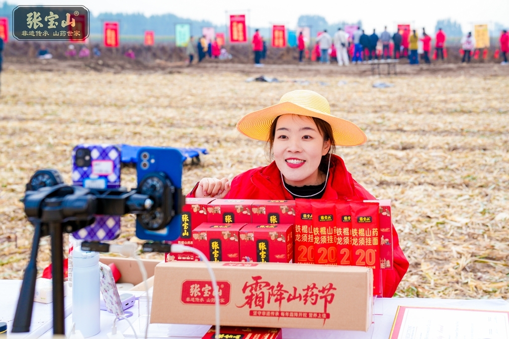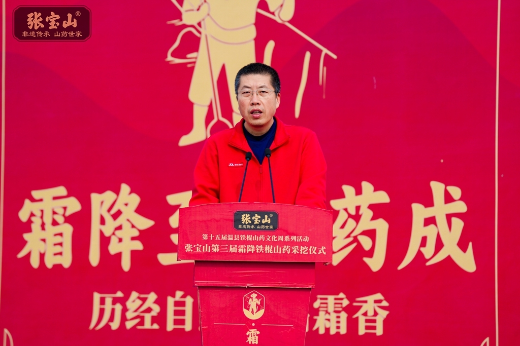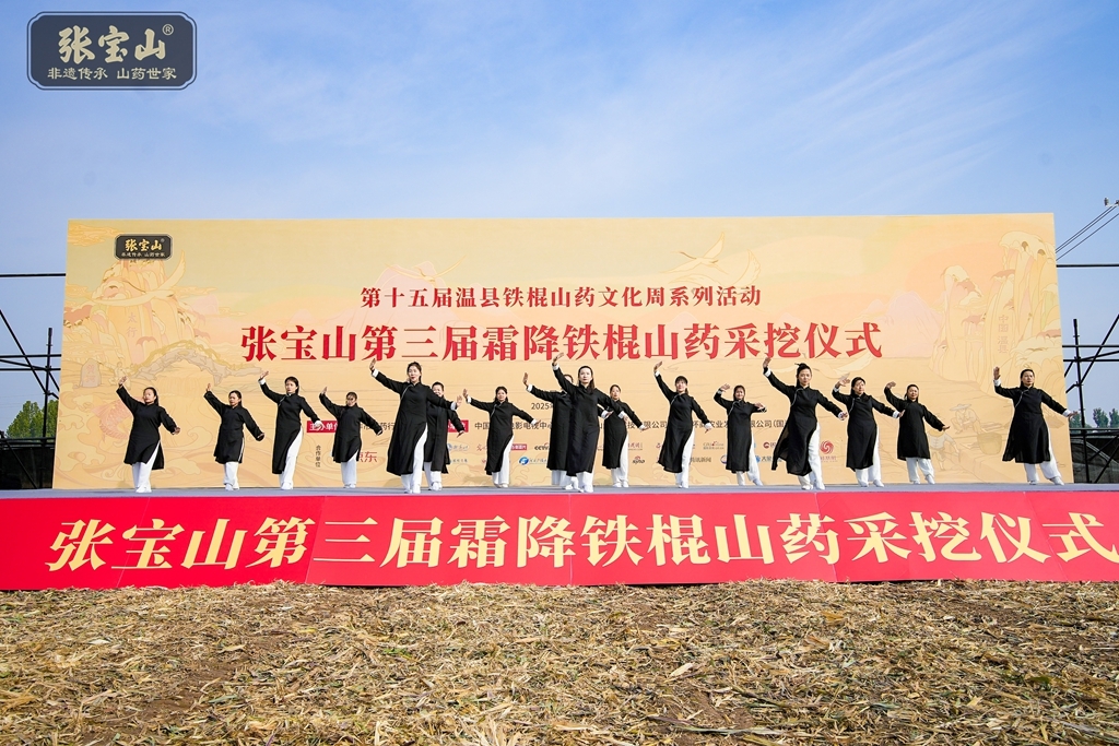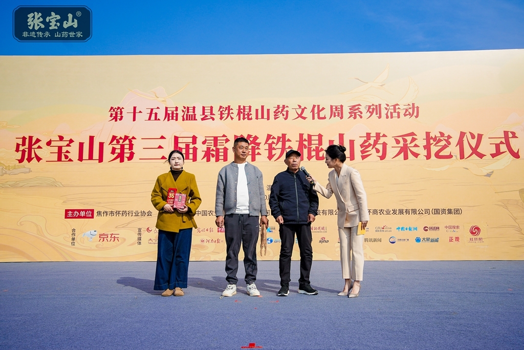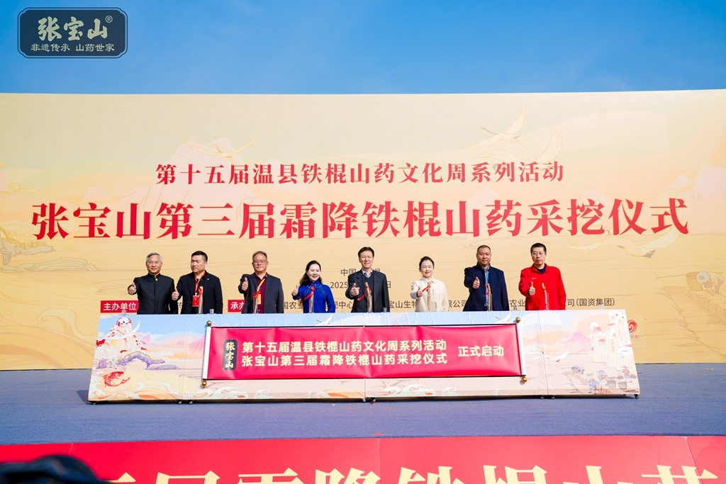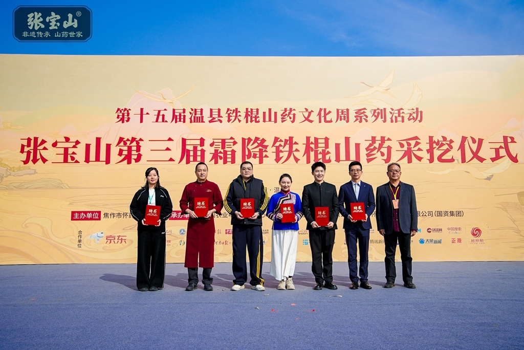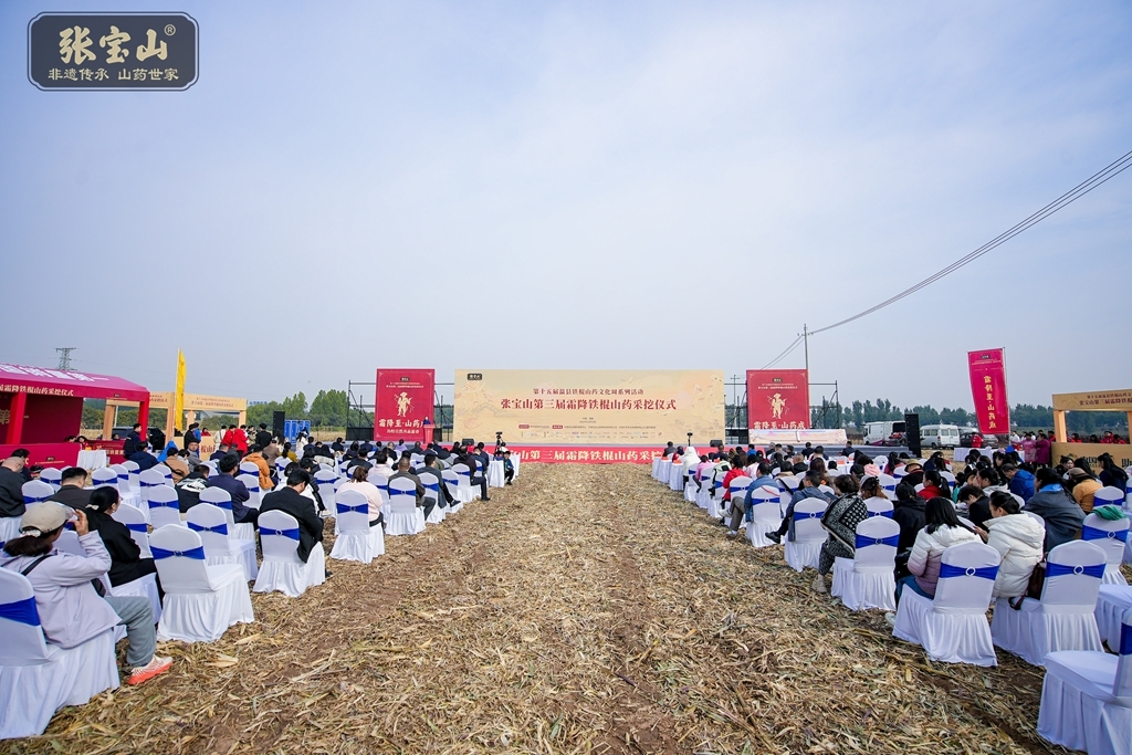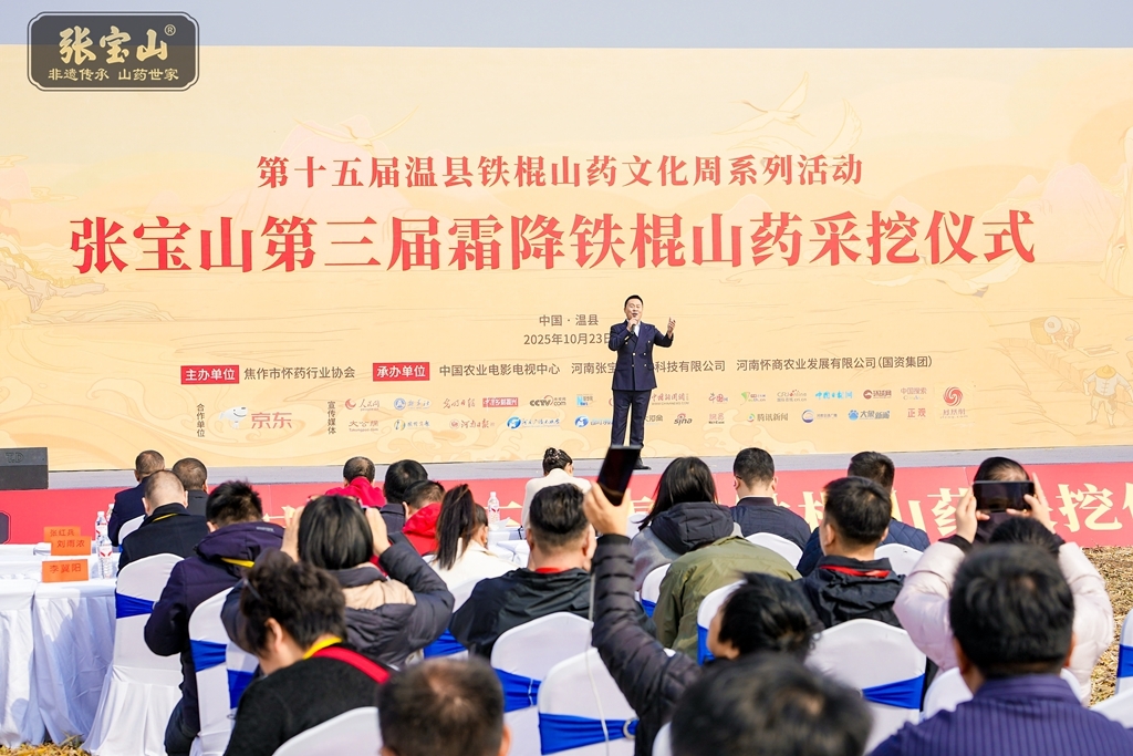 霜降至,山药成。10月23日上午,第十五届温县铁棍山药文化周系列活动——张宝山第三届霜降铁棍山药采挖仪式在河南温县张宝山有机山药种植基地举行。本次活动由焦作市怀药行业协会主办,中国农业电影电视中心、河南张宝山生物科技有限公司、河南怀商农业发展有限公司(国资集团)共同承办。农业农村部、河南省、焦作市及温县各级领导,京东物流、远方文旅等企业代表,以及近40家权威媒体与多位网络达人齐聚一堂,共同见证这一丰收盛事,感受铁棍山药的非遗魅力和深厚文化底蕴。