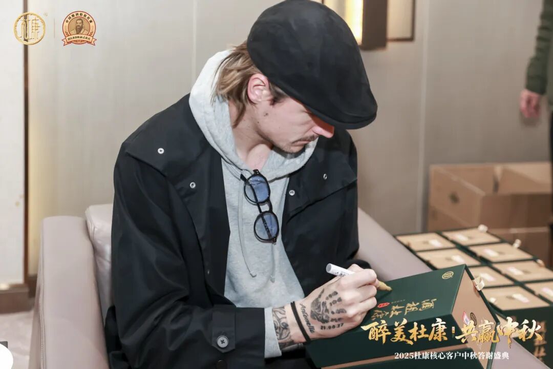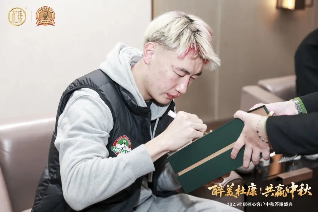 图为:河南酒祖杜康队球员迈达纳、刘易鑫在杜康中秋答谢盛典上为客户签名