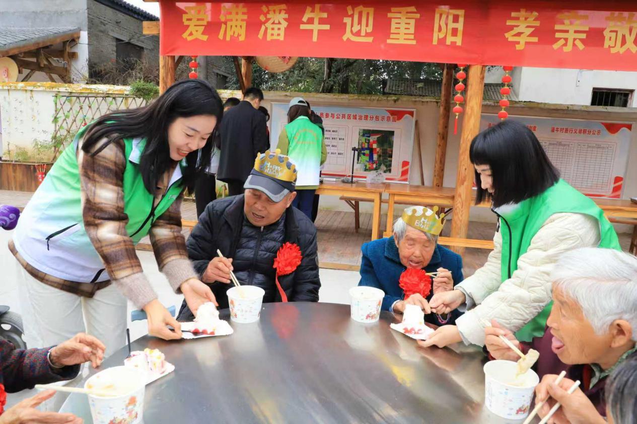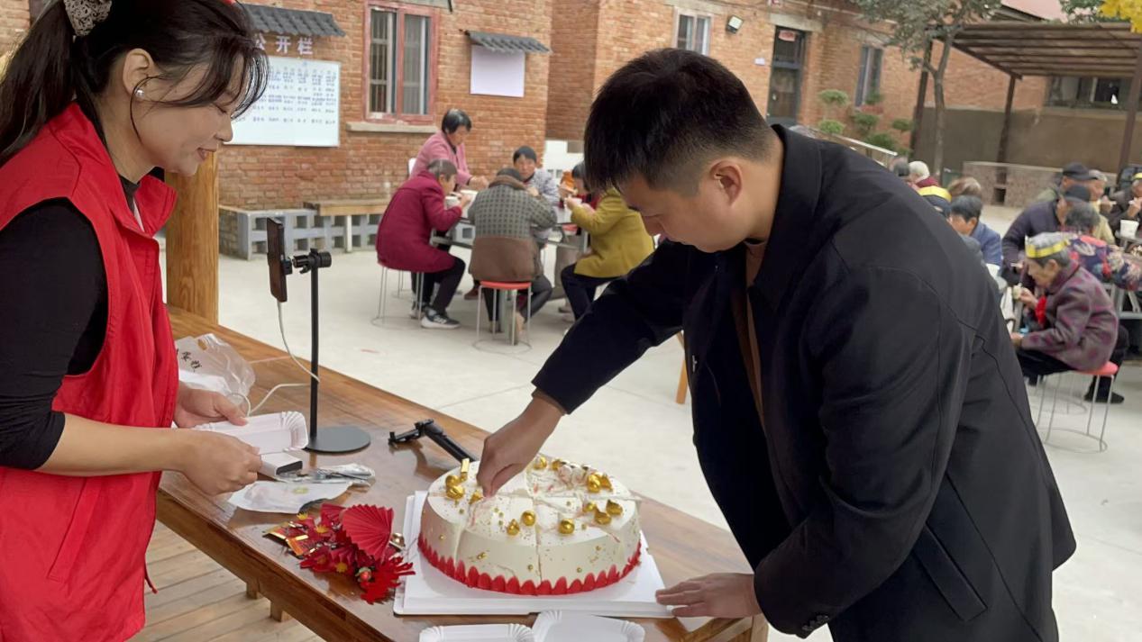 在临颍县皇帝庙乡潘牛村“幸福苑”现场,志愿者和驻村第一书记赵基元准备了一场“爱满潘牛·情暖重阳”的敬老活动。 邀请市中医院的医生们开展义诊问诊,邀请理发师为老人们理发,布置天安门、迎客松等标志性人文自然背景让老人们通过“云游”合影形式“圆梦现场”,圆了一个“走出去看看”的心愿;通过“投壶”等游戏锻炼老人们的互动能力,给老人们带来更多快乐;举办“寿星贺重阳”活动,为村里几位90岁以上的高龄老人佩戴上大红花和生日帽,并送上精心定制的寿星大蛋糕;在包饺子现场,志愿者和面、擀皮、包馅等动作行云流水;热腾腾的饺子端上桌,老人们围坐在一起,边吃边唠家常。在“结对连心祝福墙”上,参与者写下一张张祝福卡片:“愿潘牛村越来越美,老人健康长寿”……