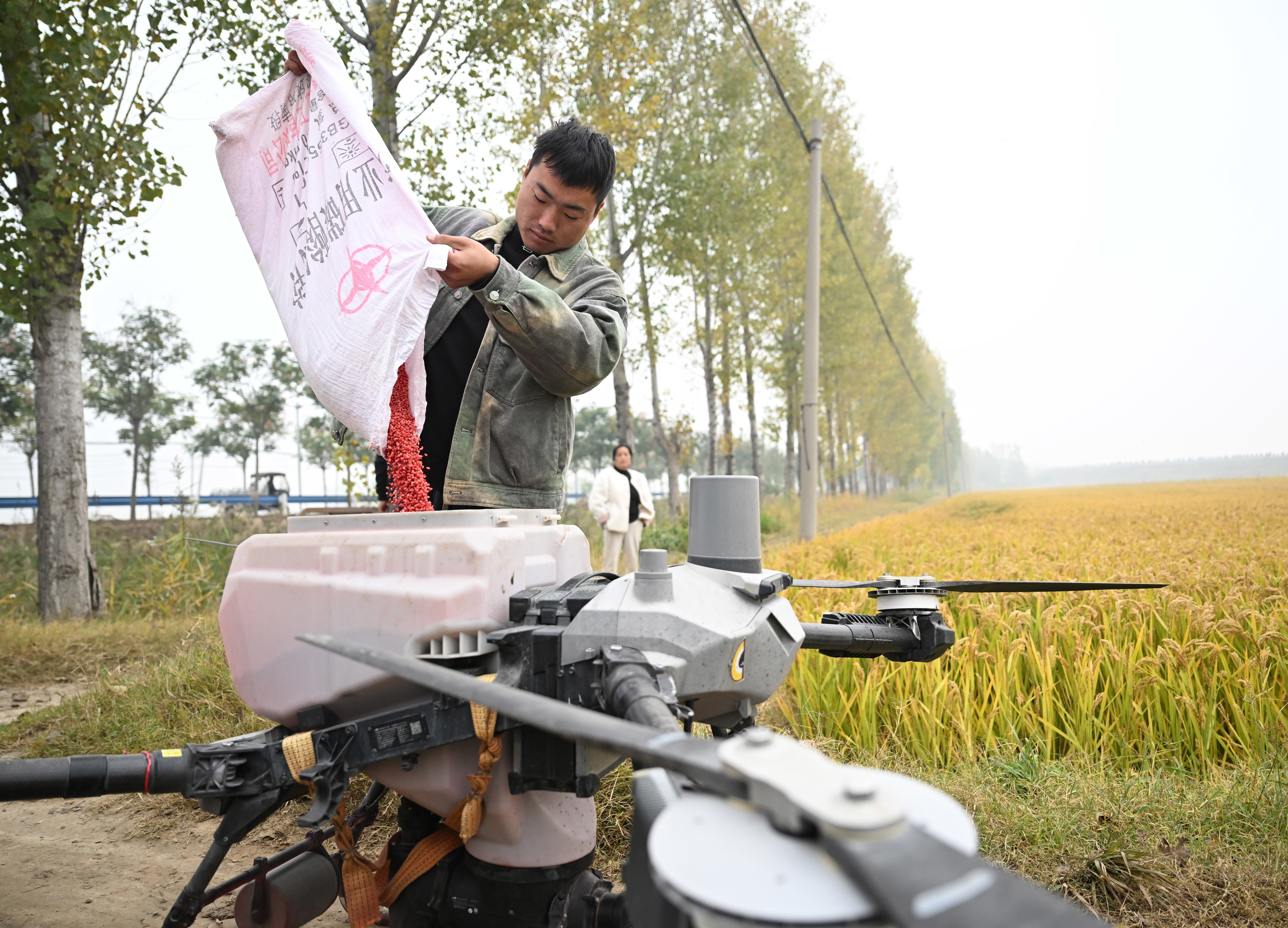 10月30日,在河南省原阳县太平镇太南村,农机手向无人机加载小麦种子。新华社记者 李嘉南 摄