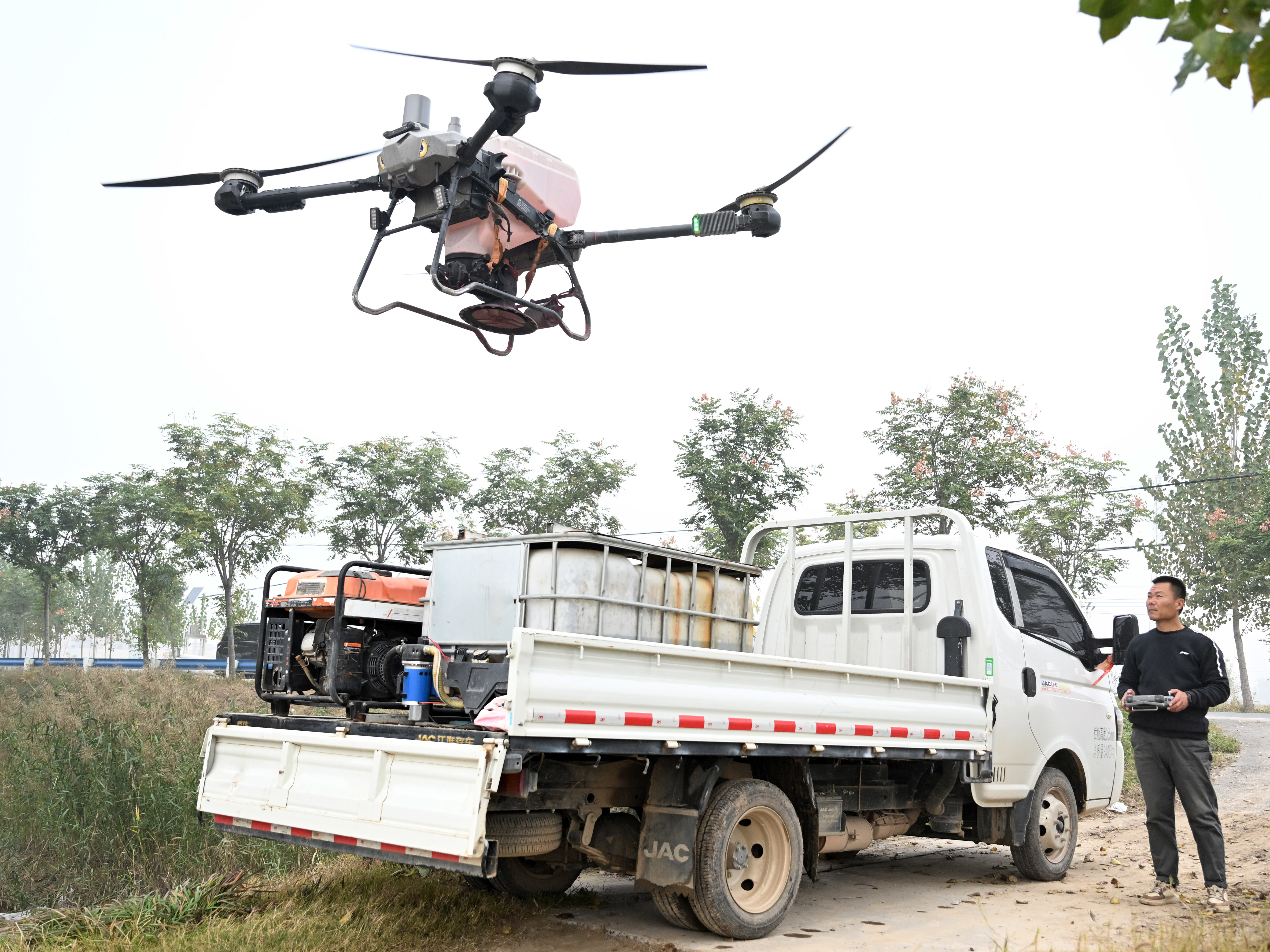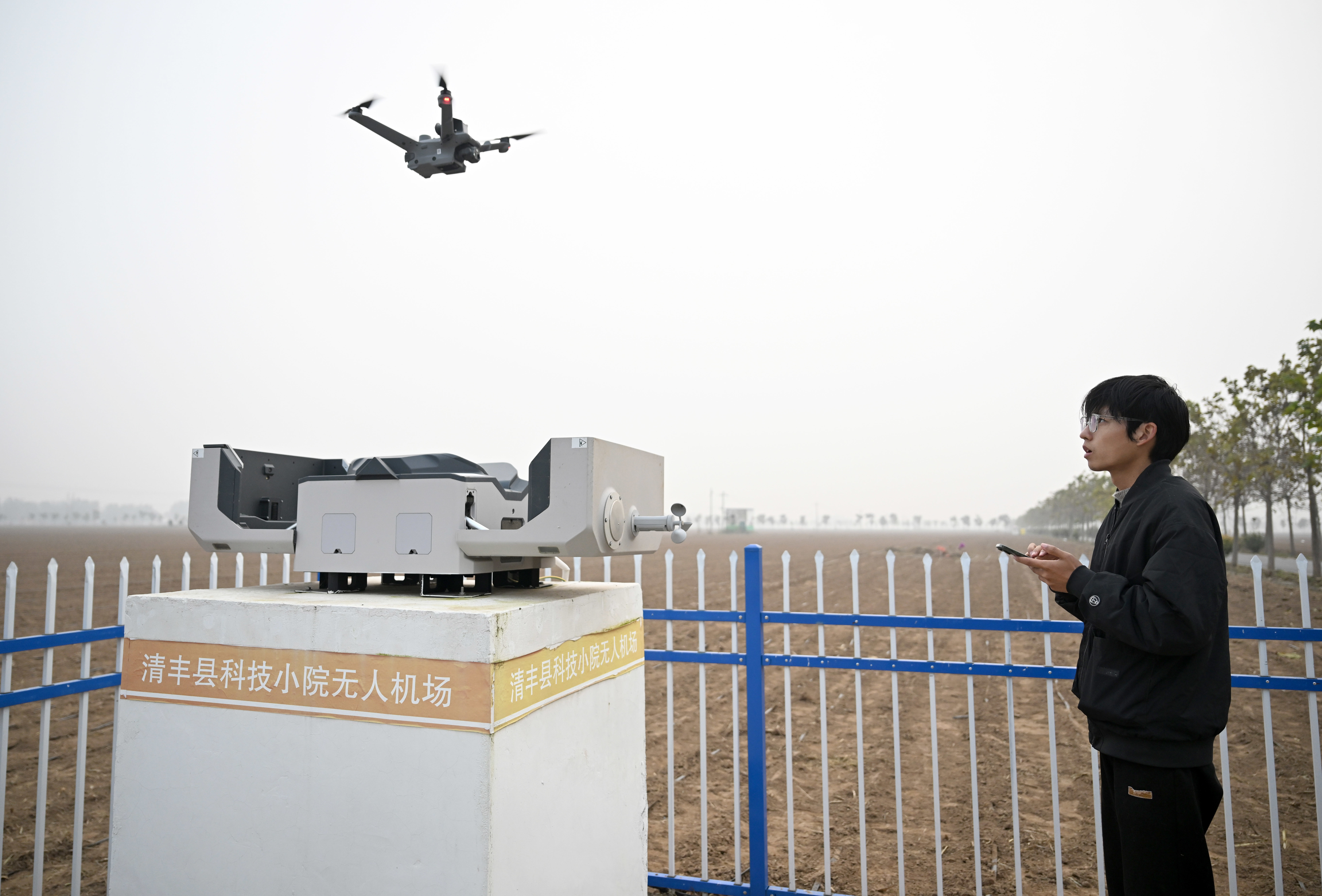 10月30日,在河南省清丰县固城镇张庄里村,农户在操作无人巡田机起飞。新华社记者 李嘉南 摄