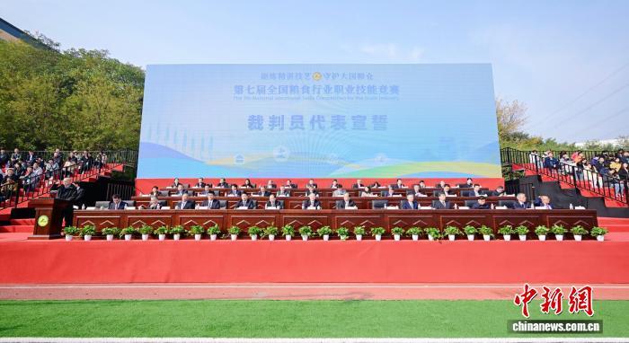 11月4日,第七届全国粮食行业职业技能竞赛在河南郑州开幕。34支代表队的354名选手围绕粮油保管员、粮油质量检验员两个工种7个项目进行技能角逐。图为第七届全国粮食行业职业技能竞赛开幕式现场。中国粮食研究培训中心 供图
