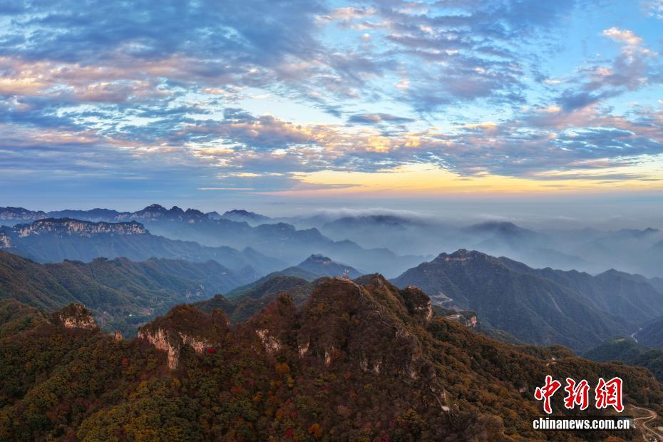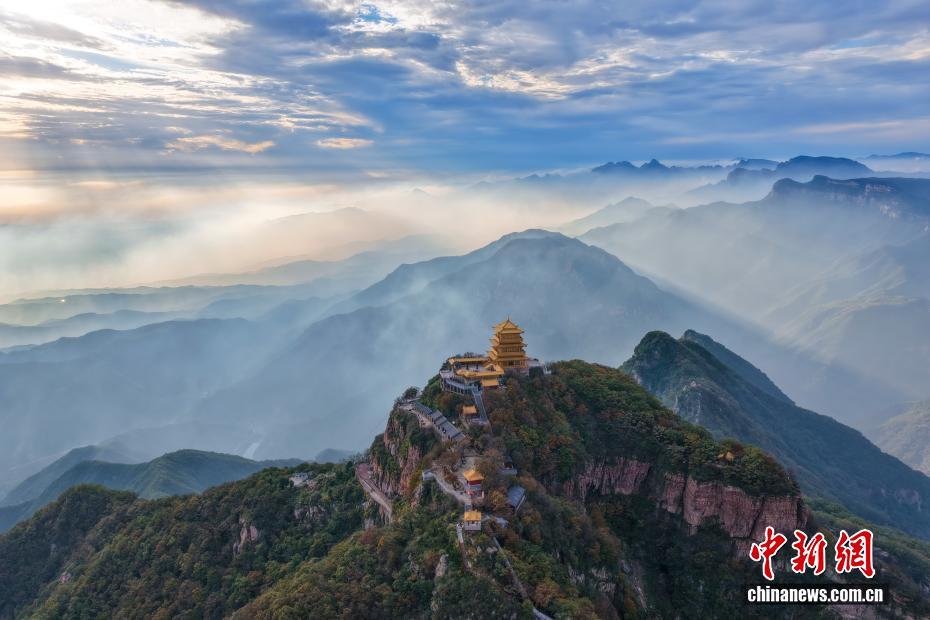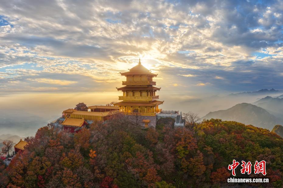 金秋时节,河南济源黄河湿地金黄树影与澄澈水面交相辉映,王屋山山间植被色彩斑斓,吸引众多游客前来捕捉自然之美。图为王屋山金顶晨光。宇森 摄