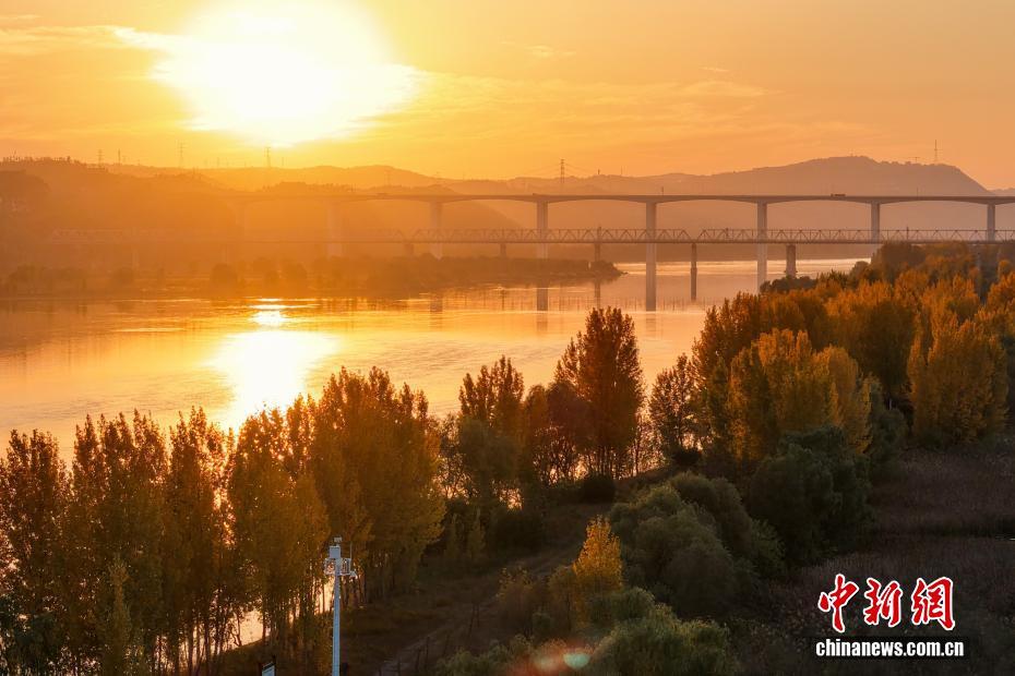 金秋时节,河南济源黄河湿地金黄树影与澄澈水面交相辉映,王屋山山间植被色彩斑斓,吸引众多游客前来捕捉自然之美。图为黄河湿地黄昏。宇森 摄