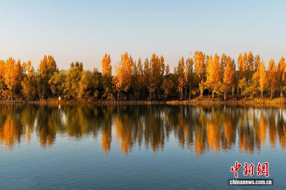 金秋时节,河南济源黄河湿地金黄树影与澄澈水面交相辉映,王屋山山间植被色彩斑斓,吸引众多游客前来捕捉自然之美。图为黄河湿地秋景。宇森 摄