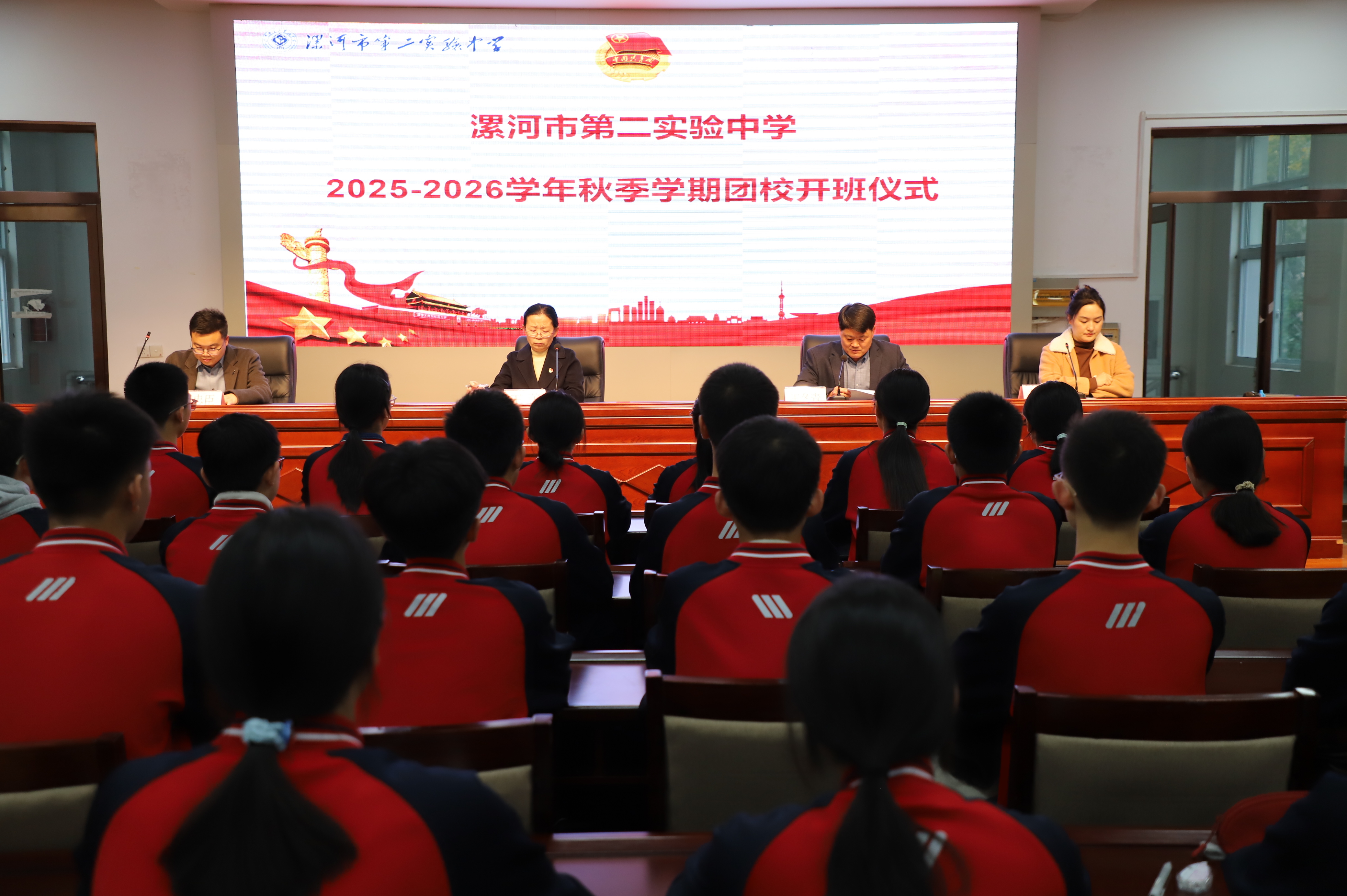 为深入学习贯彻党的二十届四中全会精神,认真学习领会团的十九大精神,加强青年学生思想政治引领,充分发挥中学团校的育人引领作用,11月6日,漯河市第二实验中学举行了2025年秋季团校开班仪式暨团课第一讲。漯河市第二实验中学党总支书记王蕾,党总支副书记、校长王冬青,校团委书记汤忠臣,全体入团积极分子参加了此次开班仪式。仪式由校团委副书记杜千主持。