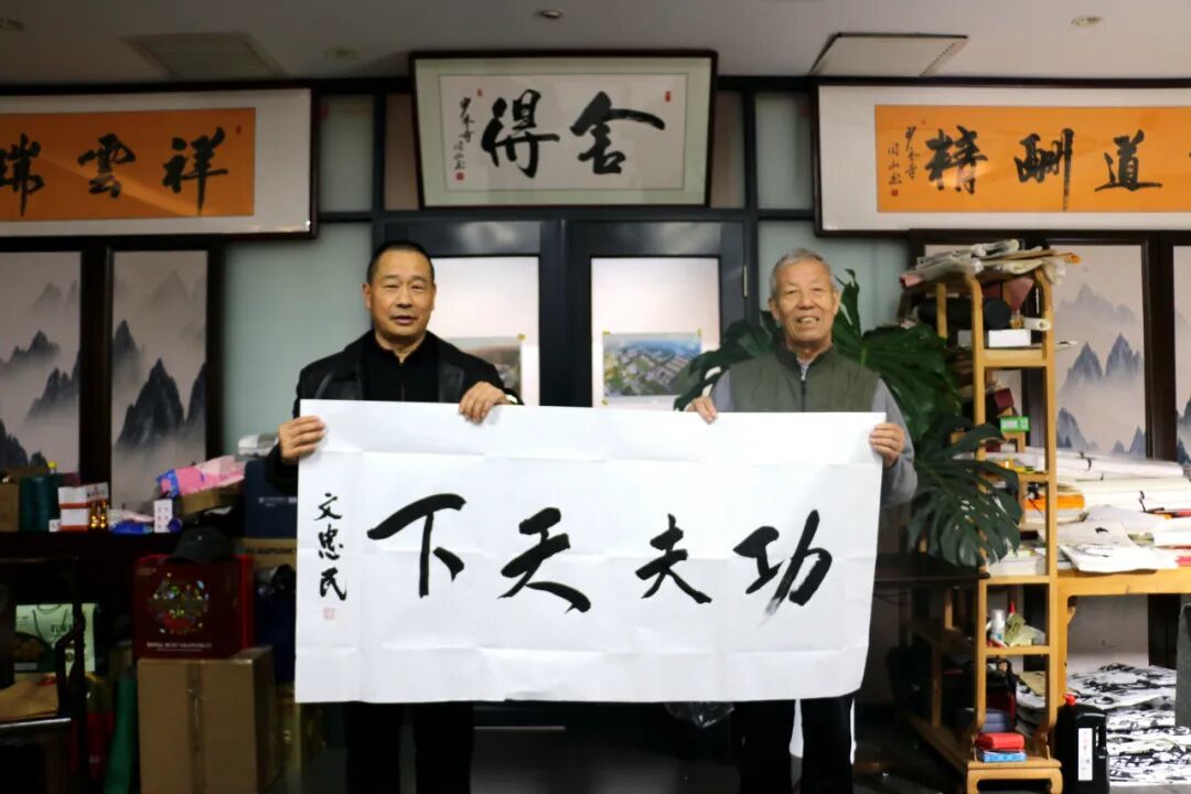 功夫表演过后,在小龙教育集团董事长陈同山的书法室,一场温馨而富有文化气息的茶叙与书法交流活动拉开帷幕。文忠民将军兴致盎然,现场挥毫泼墨,欣然为陈同山、陈同川兄弟俩分别题写“龙腾虎跃”“功夫天下”两幅墨宝,笔力遒劲、气势磅礴,既饱含对兄弟二人致力于武术教育事业的肯定,也寄托了对少林小龙武校未来发展的殷切期望。陈同山董事长也应邀挥毫,书就“舍得""真功夫”“养德泽福”分别赠予各位领导。墨宝赠予之际,众人再次合影,让此次武术文化行的文化交流氛围达到高潮。