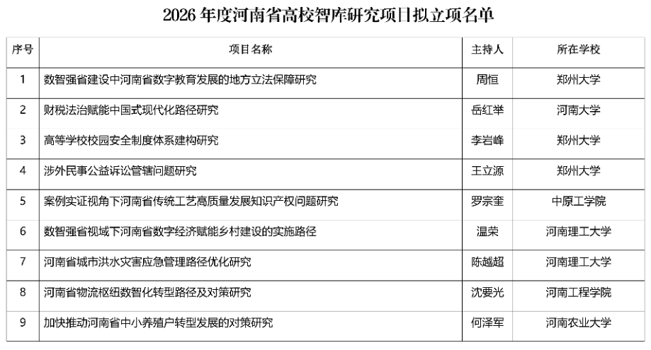 河南省教育厅关于2026年度河南省高等学校智库研究项目拟立项名单的公示