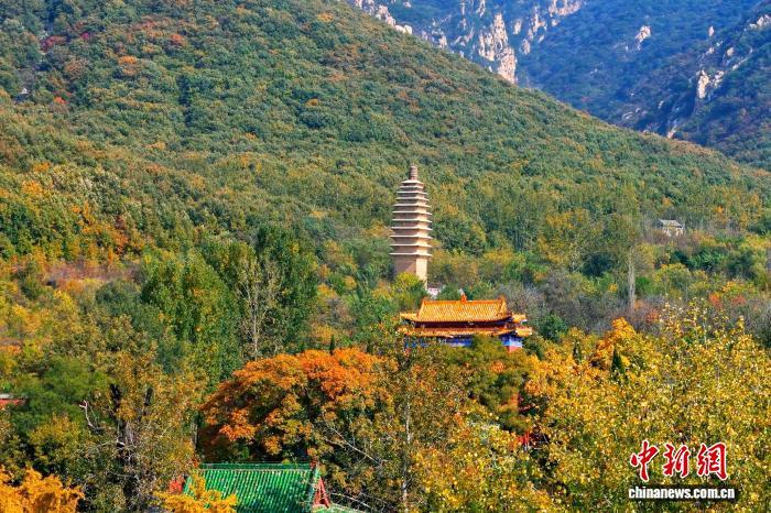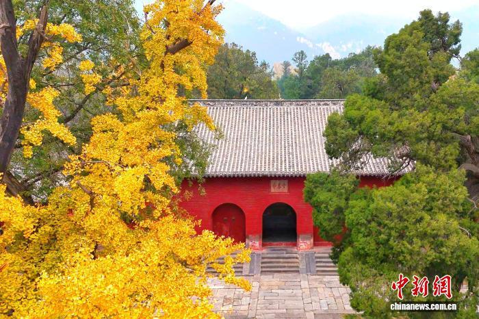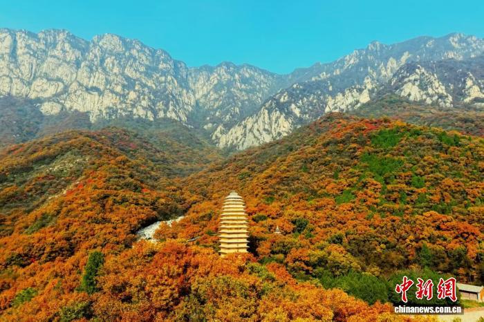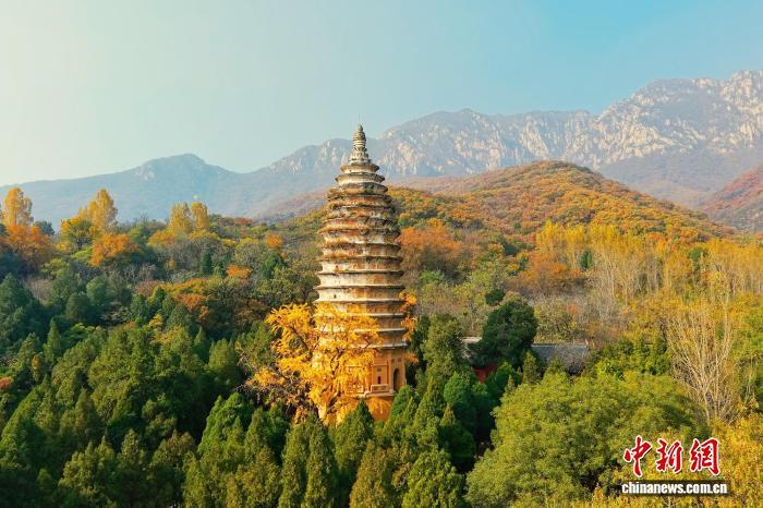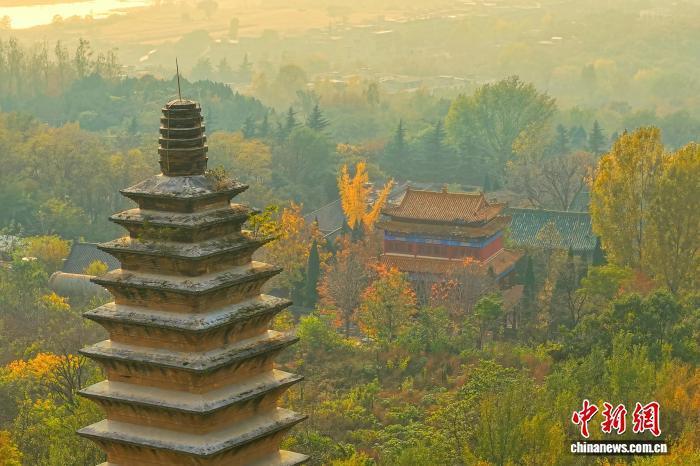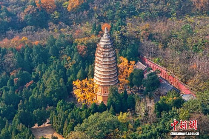 入冬后,河南登封嵩山古树披金,掩映在山林间的嵩岳寺塔、法王寺塔等古建筑宛如“换上”冬季限定“新装”,古塔、古寺与巍峨嵩山构成一幅浓墨重彩的冬日画卷。图为嵩山古建筑群秋光正盛。(无人机照片) 郑州市文物局供图