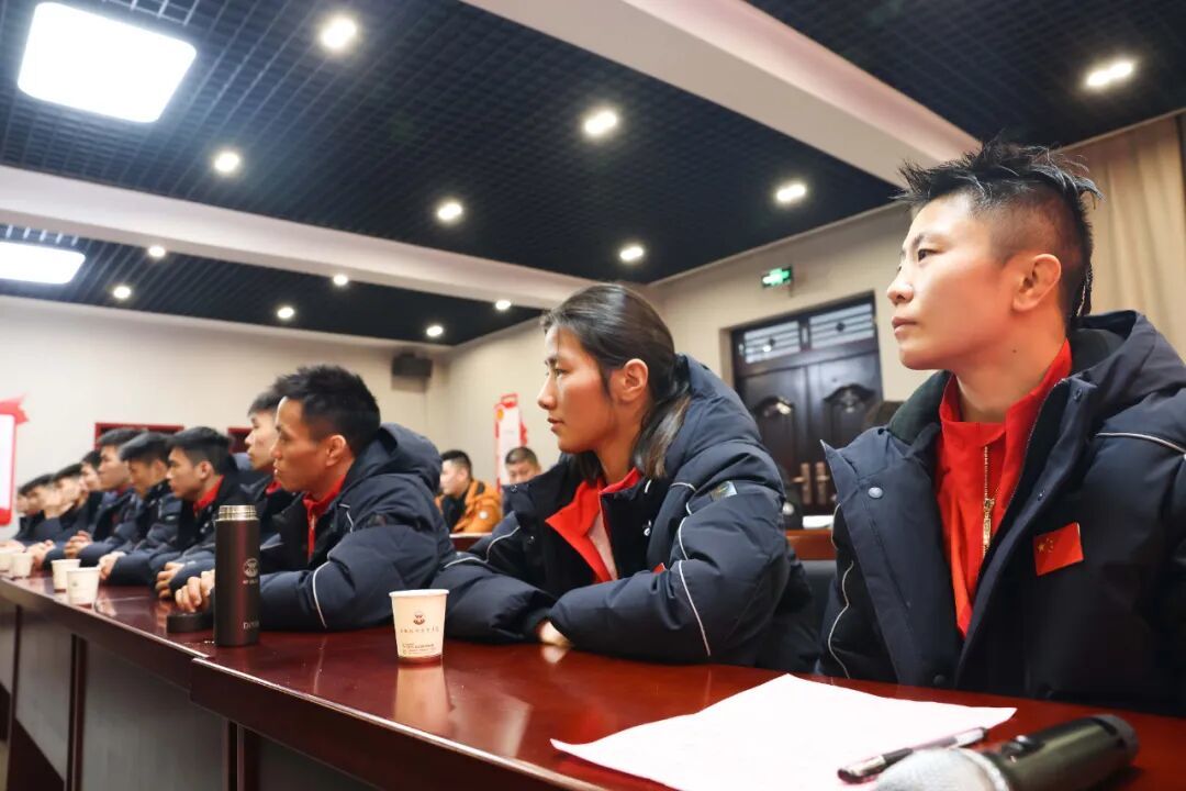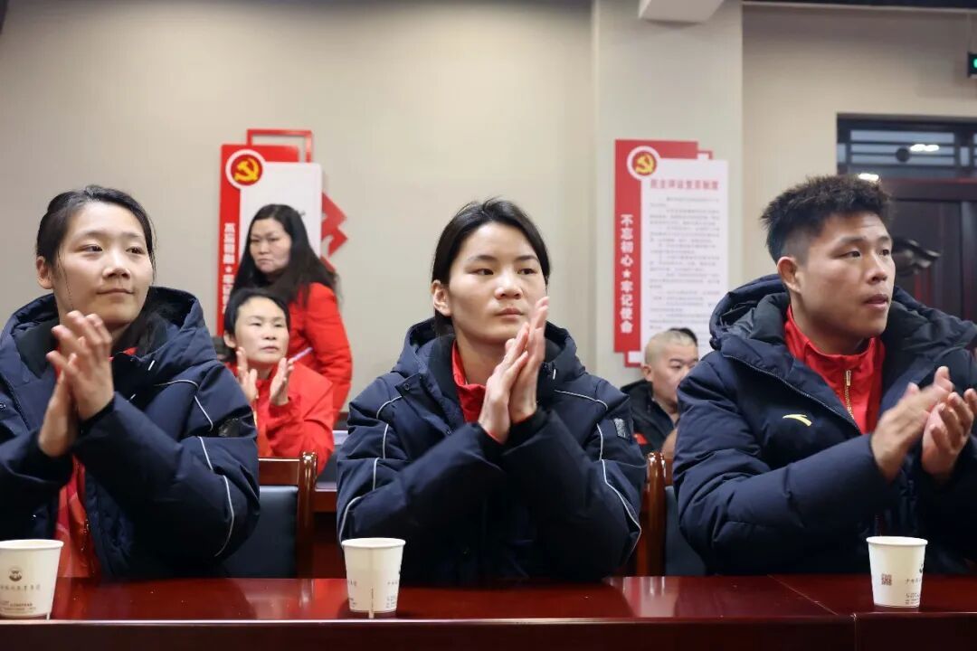 在会议室,刘海科首先汇报了参赛情况,他分析了本次比赛的优势项目与关键得分点,介绍了通过科学训练体系精准调控运动员竞技状态的做法,强调“反对野蛮训练,但不能不练”的训练理念。他说道:“优异成绩的取得离不开强有力的后勤保障,更离不开全体队员和教练员团结一心、奋力拼搏的精神。”随后,大家一同观看了全运会参赛及夺金视频。