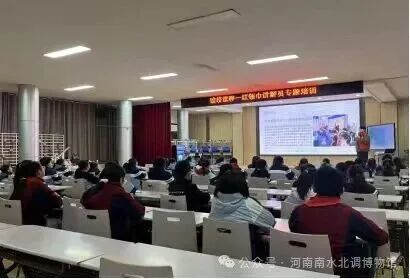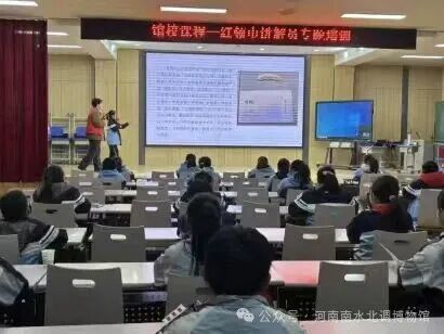 来自博物馆的讲解员老师以礼仪教学为切入点,系统教学讲解礼仪规范、语言表达技巧等基础内容。课堂上,通过情景提问、动作示范等互动形式,引导学生主动参与,为了让学生更直观地感受讲解魅力,课堂上还播放了之前参加过河南南水北调博物馆讲解的优秀小讲解员的范例视频。视频中,小讲解员们从容自信的仪态、流畅生动的表达,不仅展现了扎实的知识储备,更传递出对文化传承的热忱,让在场学生深受启发,学习兴趣被进一步激发。