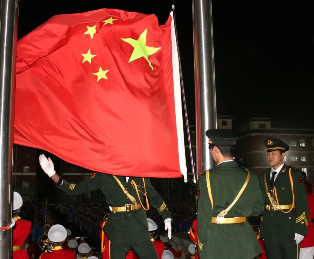 随着主持人庄重指令,护旗手们身着整齐礼服,迈着习武人特有的沉稳步伐,擎举五星红旗稳步走向旗杆。他们身姿挺拔如松,每一步都踏得坚定有力,既彰显着武者的刚毅风骨,更饱含着对祖国的无限崇敬。