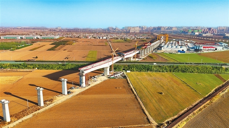 11月26日,随着最后一方混凝土精准入模,由中铁十五集团承建的平漯周高铁站前五标舞漯特大桥跨宁洛高速连续梁顺利合龙。平漯周高铁是国家铁路网规划的重要组成部分,西起郑渝高铁平顶山西站,东至郑阜高铁周口东站,正线长度199.679公里。记者 聂冬晗 摄