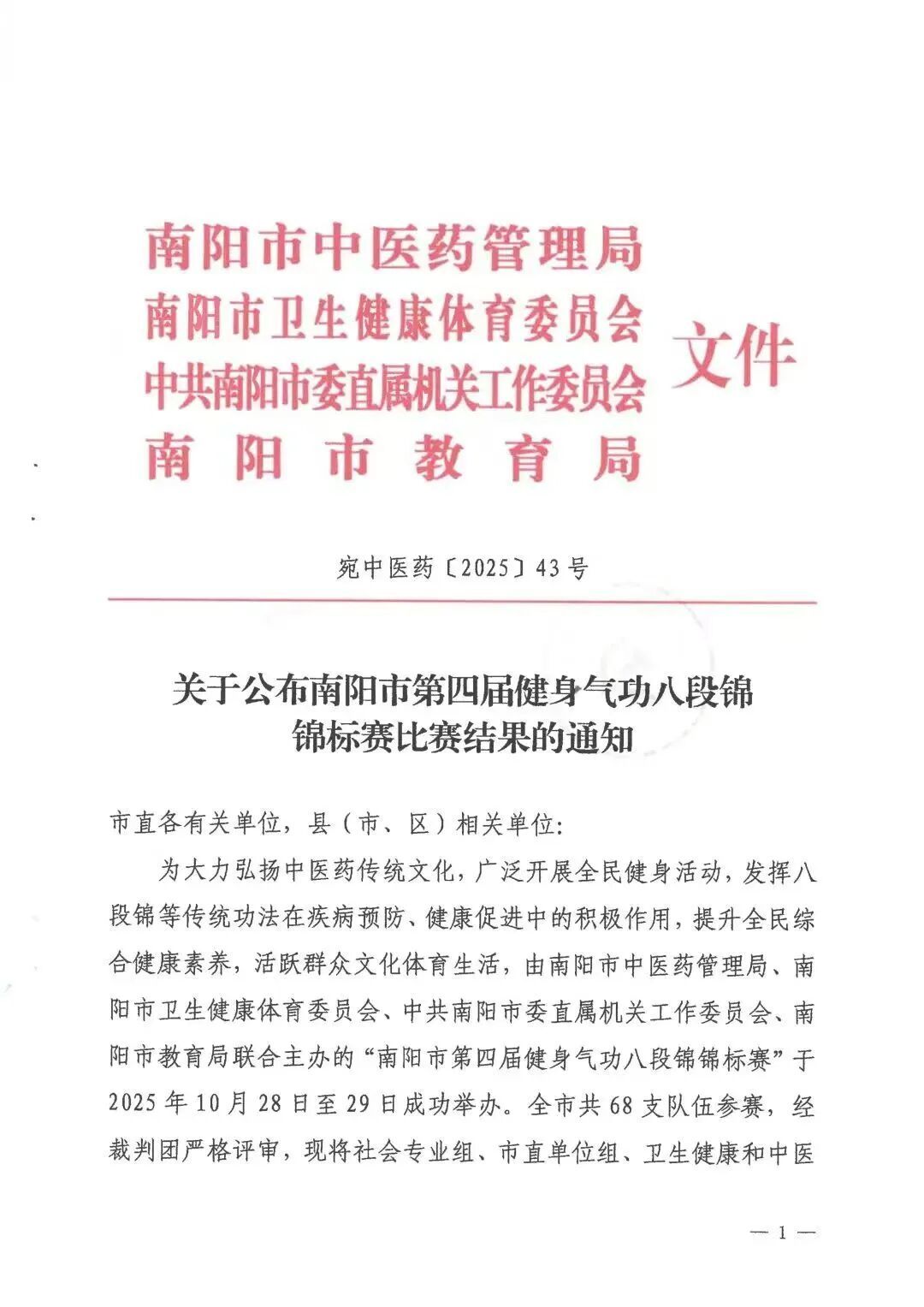 近日,南阳市第四届健身气功八段锦锦标赛圆满落幕。镇平县中医院代表队凭借扎实的功底、默契的配合与对传统养生功法的深刻诠释,在众多强队中崭露头角,荣获卫生健康和中医药组二等奖。