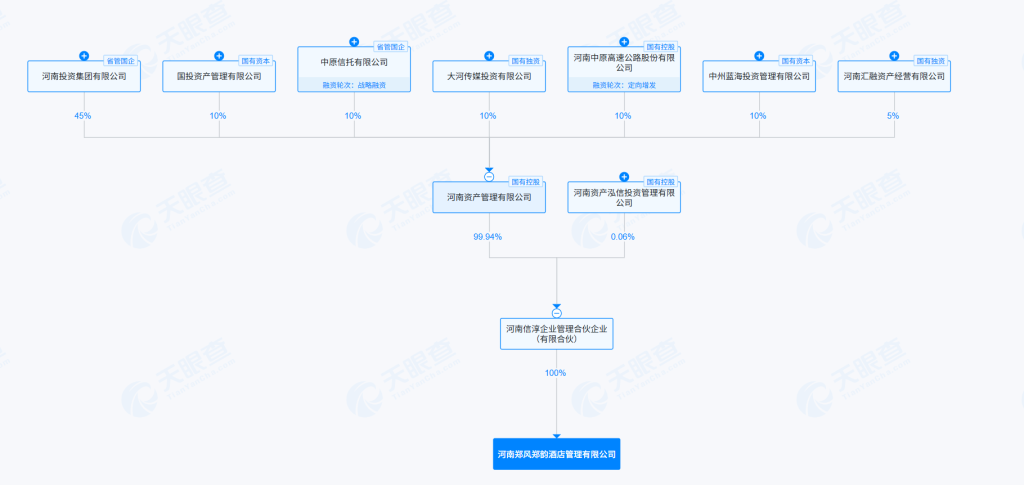 天眼查披露的信息显示,河南郑风郑韵酒店管理公司为河南信淳企业管理合伙企业(有限合伙)全资子公司,国有控股企业河南资产管理有限公司持有后者99.94%股权。