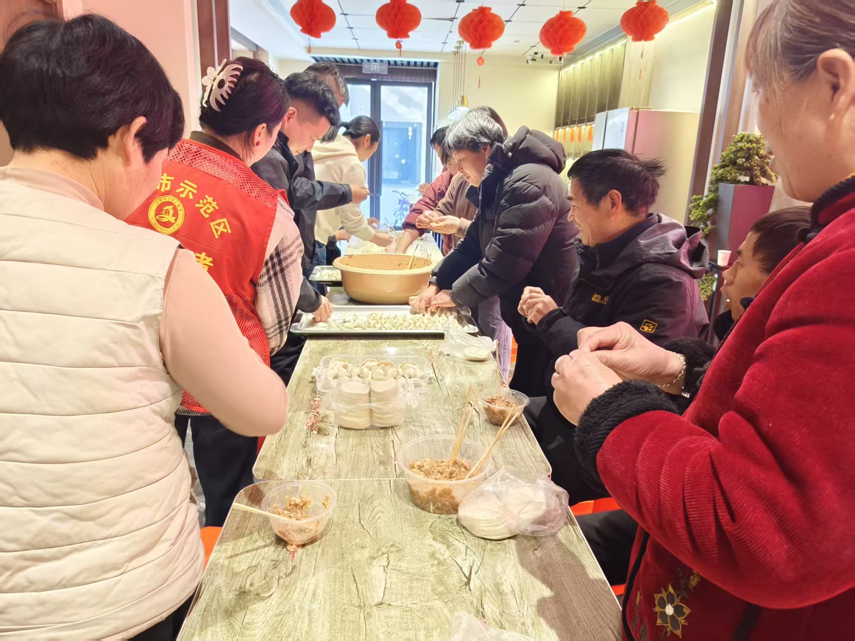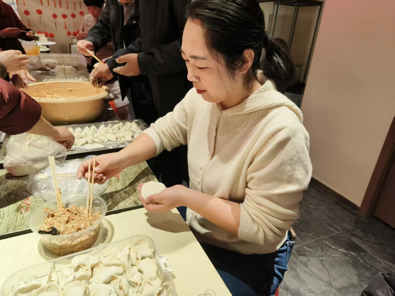 活动现场暖意融融,处处洋溢着欢乐祥和的氛围。带着孩子的爷爷奶奶们早早来到现场,一边忙碌着包饺子一边分享着家常趣事;恰逢休假的年轻人也热情满满地加入其中,有的跟着长辈认真学习包饺子的技巧,有的主动承担起摆放食材、分发工具的工作,大家分工协作,配合得十分默契。