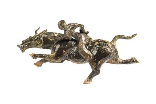 绿釉骑马俑为马与人组成。马首前伸、体态雄健,三蹄腾起,一蹄着地,马尾飞扬,为飞奔状。武士一手持大刀横跨马背上,腰间斜挎强弓,一手作握缰状。通体施绿釉,釉面部分脱落。此件器物刀工凌厉,刻画清晰,人物神态冷峻剽悍,霸气十足。堪为汉代艺术之佳品。