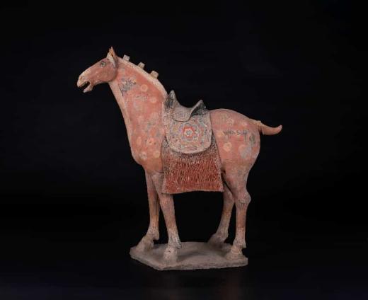 此马两耳上耸,双目圆睁,四蹄着地成行走状。头戴络头,马鬃短齐,身披攀胸和鞦带,上挂杏叶与环形饰物,马背配鞍,外包鞍袱,尾系花结。整体线条流畅,刻画清晰,丰肥适度,骨肉匀停。