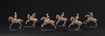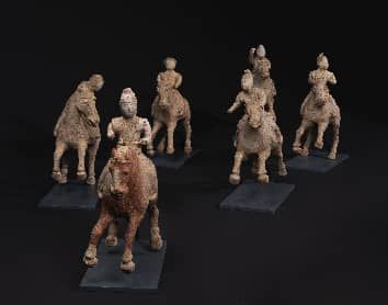 唐红陶彩绘打马球俑,一组六件,由人和马组成。马昂首前视,四蹄张开,为飞奔状。上有一人,身着长袍,俯视下方,头戴帽,姿态各异,呈抢球状。