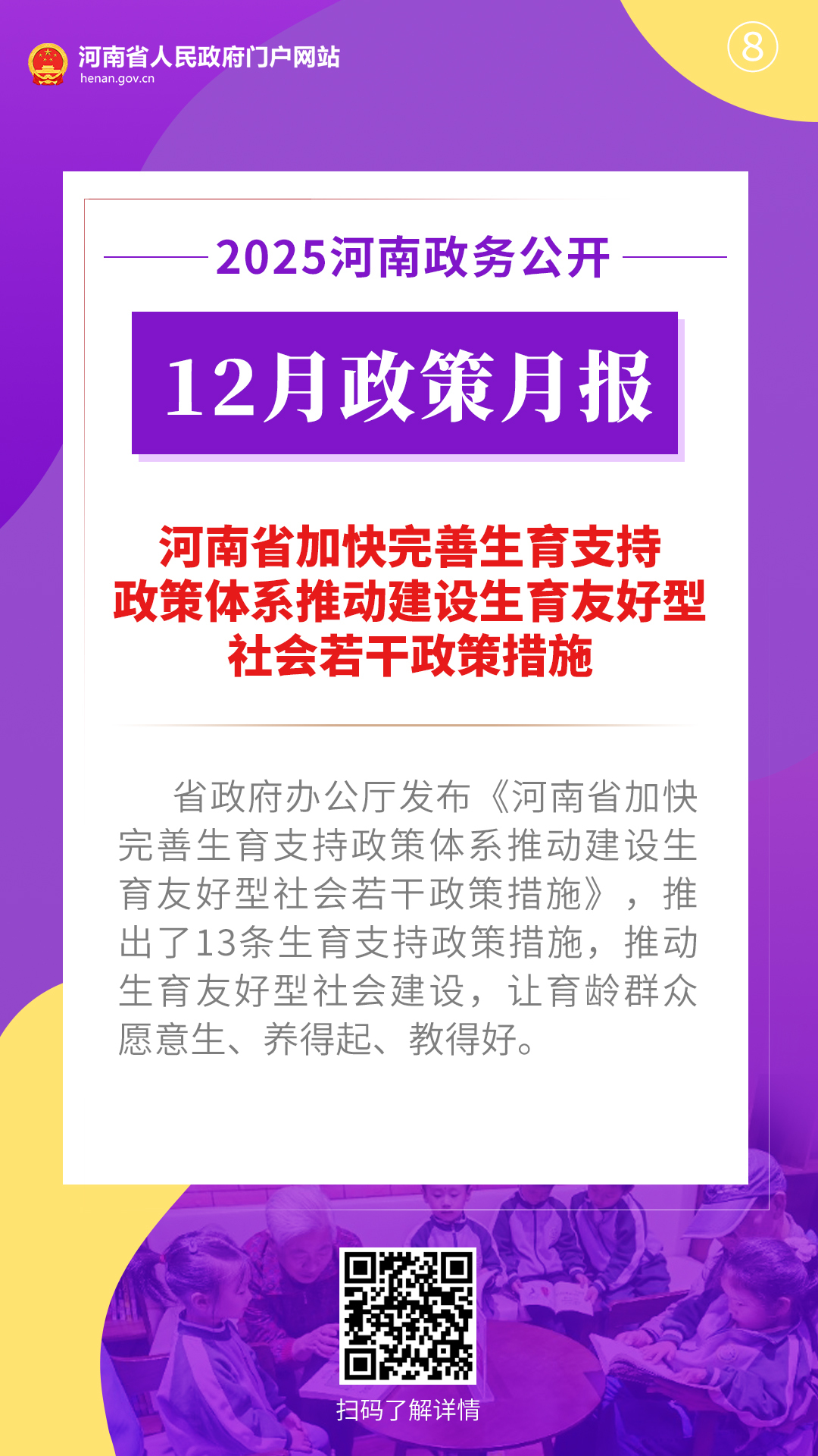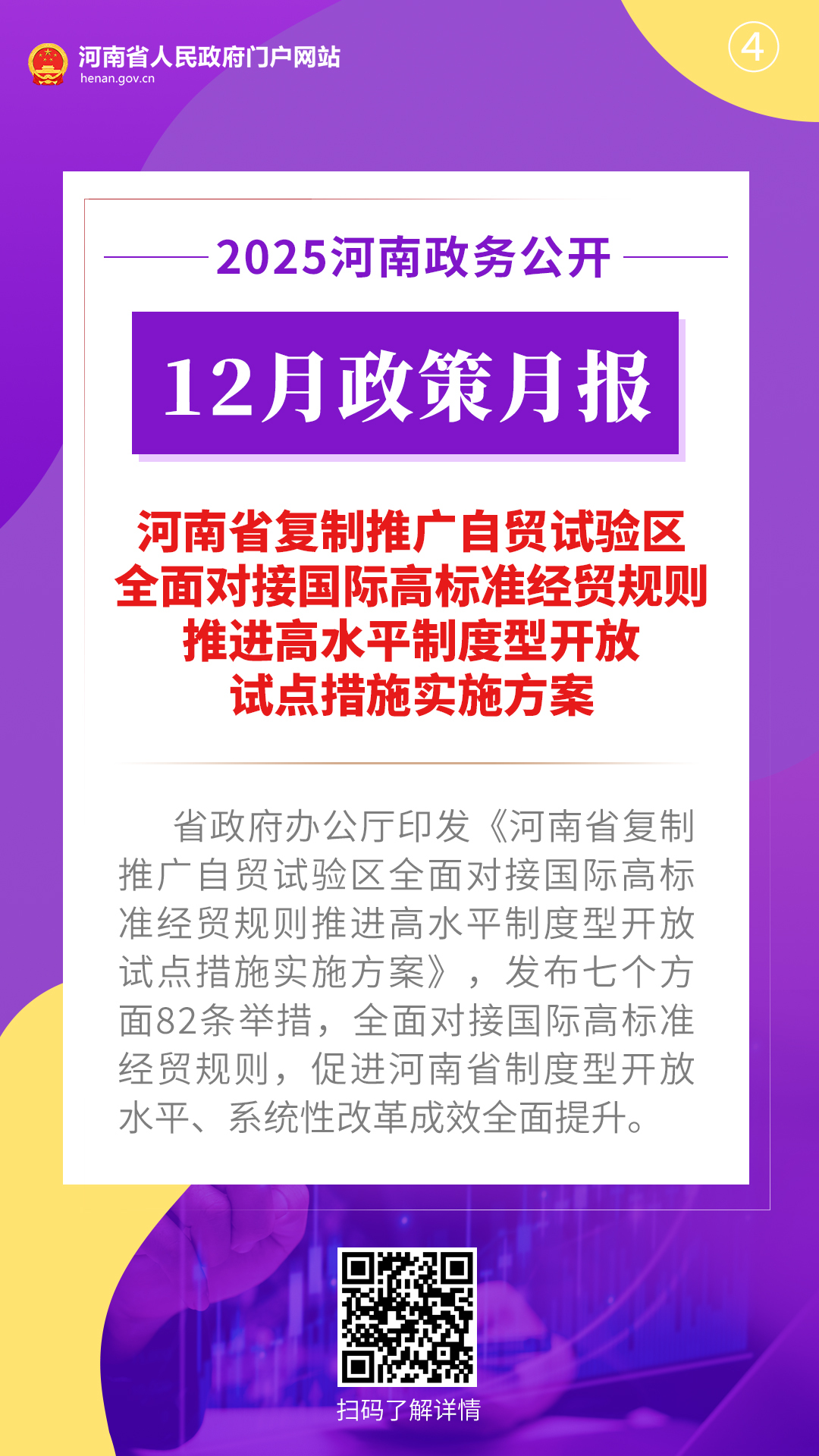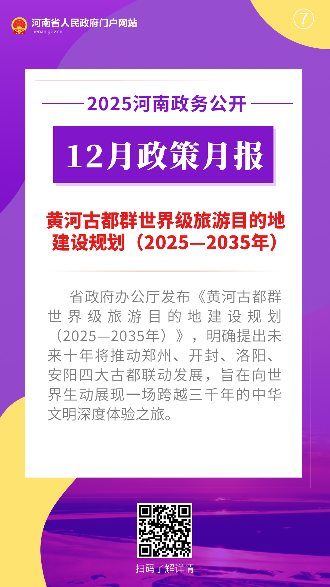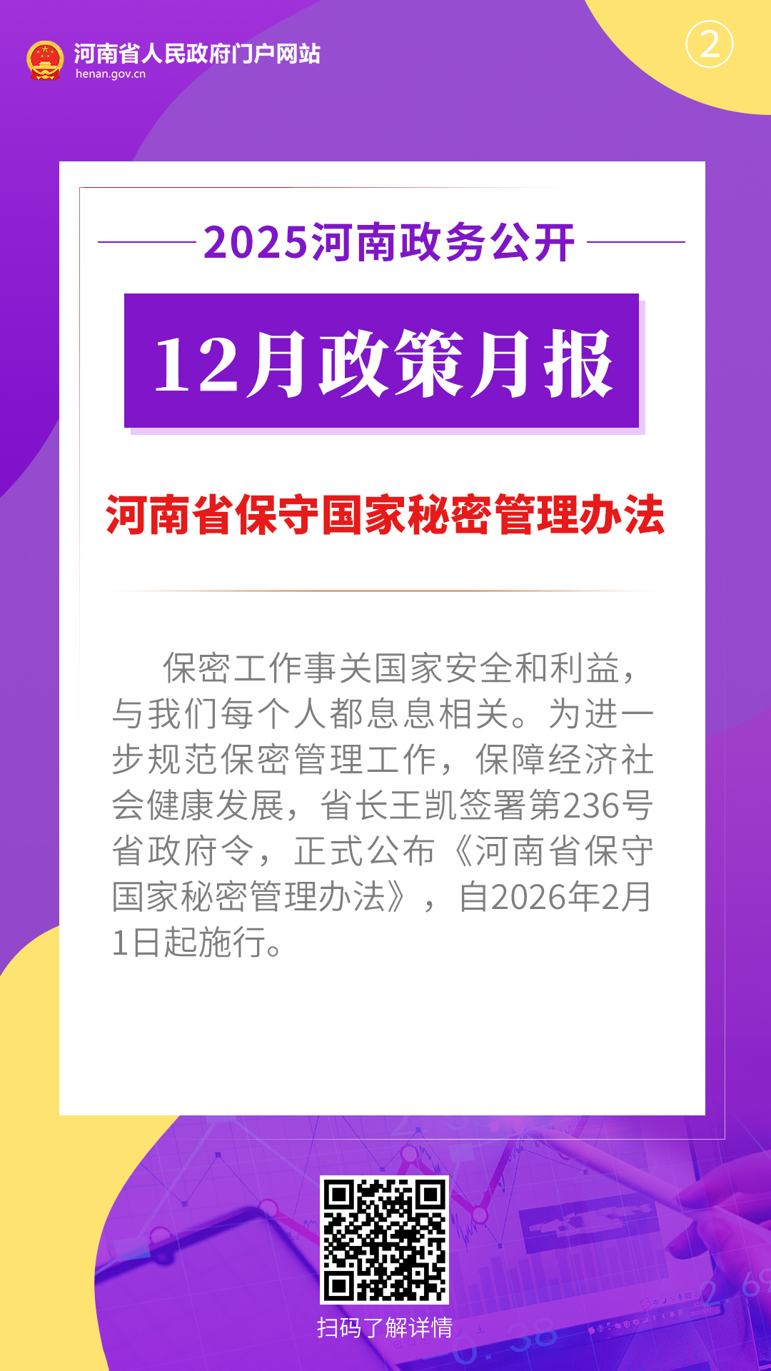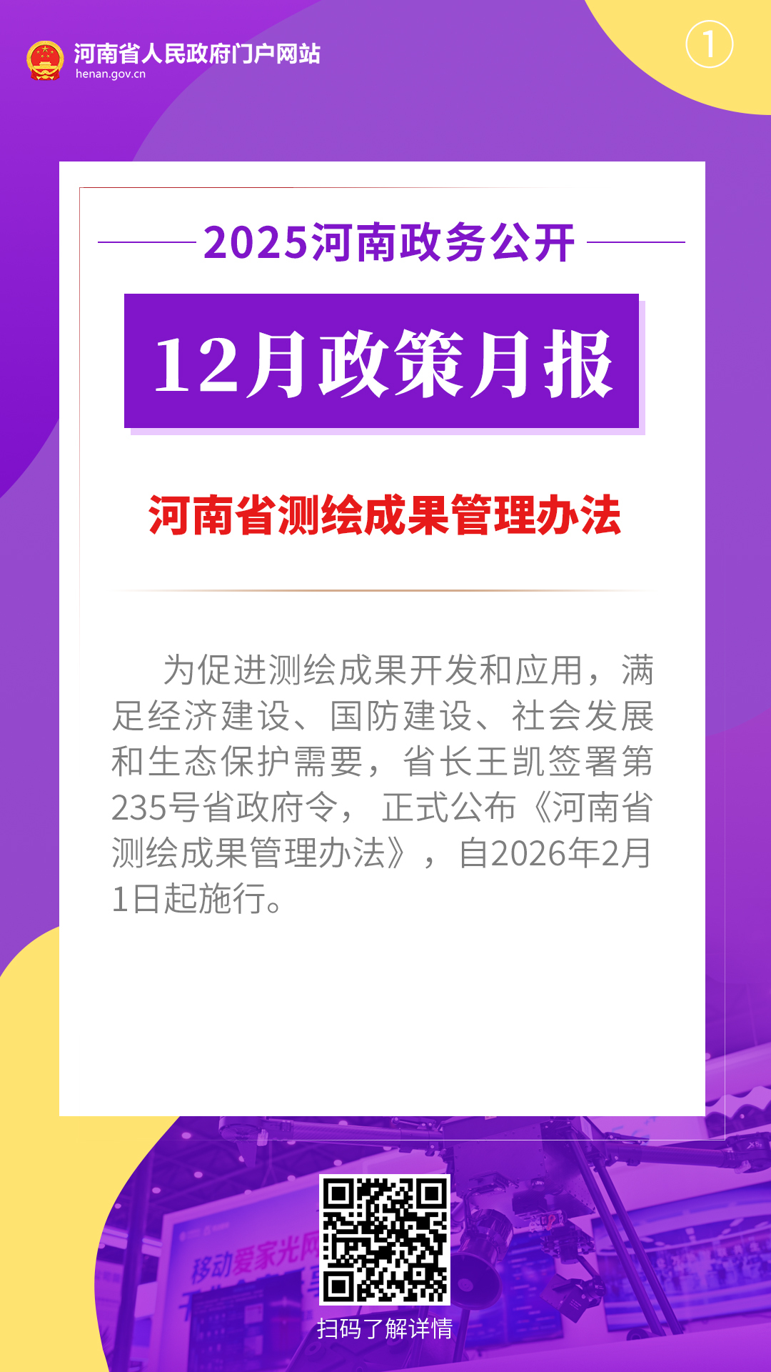 2025年12月,河南省人民政府出台多项重要政策,包括河南省测绘成果管理办法、河南省保守国家秘密管理办法、河南省复制推广自贸试验区全面对接国际高标准经贸规则推进高水平制度型开放试点措施实施方案、黄河古都群世界级旅游目的地建设规划(2025—2035年)、河南省加快完善生育支持政策体系推动建设生育友好型社会若干政策措施、河南省支持微短剧产业高质量发展若干政策措施等。通过河南政务公开12月政策月报,一起来看详情——