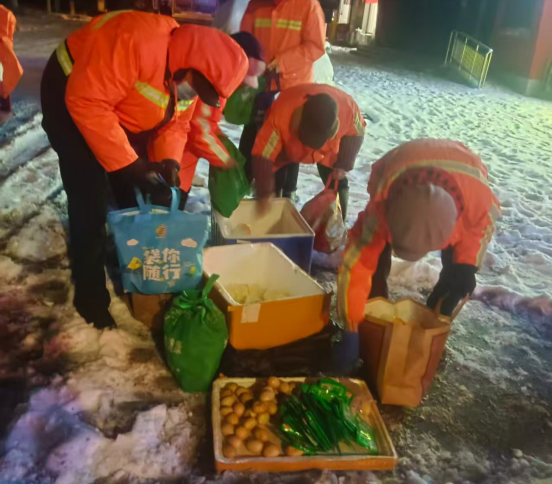 在郾城区黄河西路、召陵区香山路等多条道路,早晨7时,经过3个多小时的清扫,环卫工领取早餐,然后站在路边用餐。为了赶时间,他们顾不上蹲下吃,有的边走边吃,尽快到工作点继续清扫。一位环卫工人说,“凌晨3点多就主动出来了,雪下得大,我们就一直扫,虽天气寒冷,但大家已满身是汗。”与此同时,在城市各大主干道上,除雪车、装载车、垃圾清运车等各类车辆,正在循环往复,和降雪赛跑。