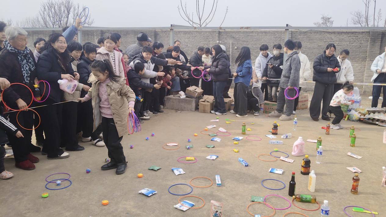趣味互动区更是人气爆棚。套圈、钉铁钉等经典乡村游戏前,老老少少排起长队,大家摩拳擦掌、踊跃参与。孩子们紧盯目标、精准投掷,老人们凝神聚力、稳扎稳打,成功闯关者领到洗衣液、牙膏、香醋、绿茶等生活用品时,脸上乐开了花。“不仅能领春联、看表演,还能玩游戏赢奖品,这样的活动太接地气了!”带着孙子参与游戏的村民张秀琴说。