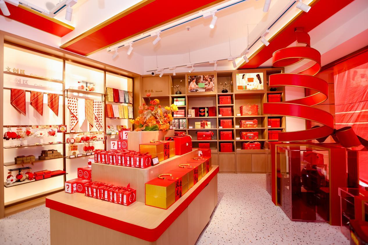 黄河路城市旗舰店绝非传统意义上的红枣专卖店。步入其中,消费者首先感受到的是空间设计的革新——近500平米的双层空间以“东方养生美学”为设计理念,将古朴的中式元素与现代简约风格巧妙融合。原木色基调搭配暖光照明,点缀着以红枣为灵感的艺术装置,营造出温暖、健康而高级的消费氛围。这里打破了传统零食门店的拥挤陈列,设置了品鉴区、文化展示区、休闲社交区以及年货礼盒定制专区,将购物体验升级为一场关于健康饮食的文化探索。