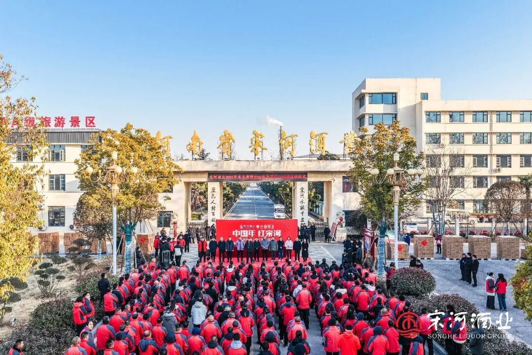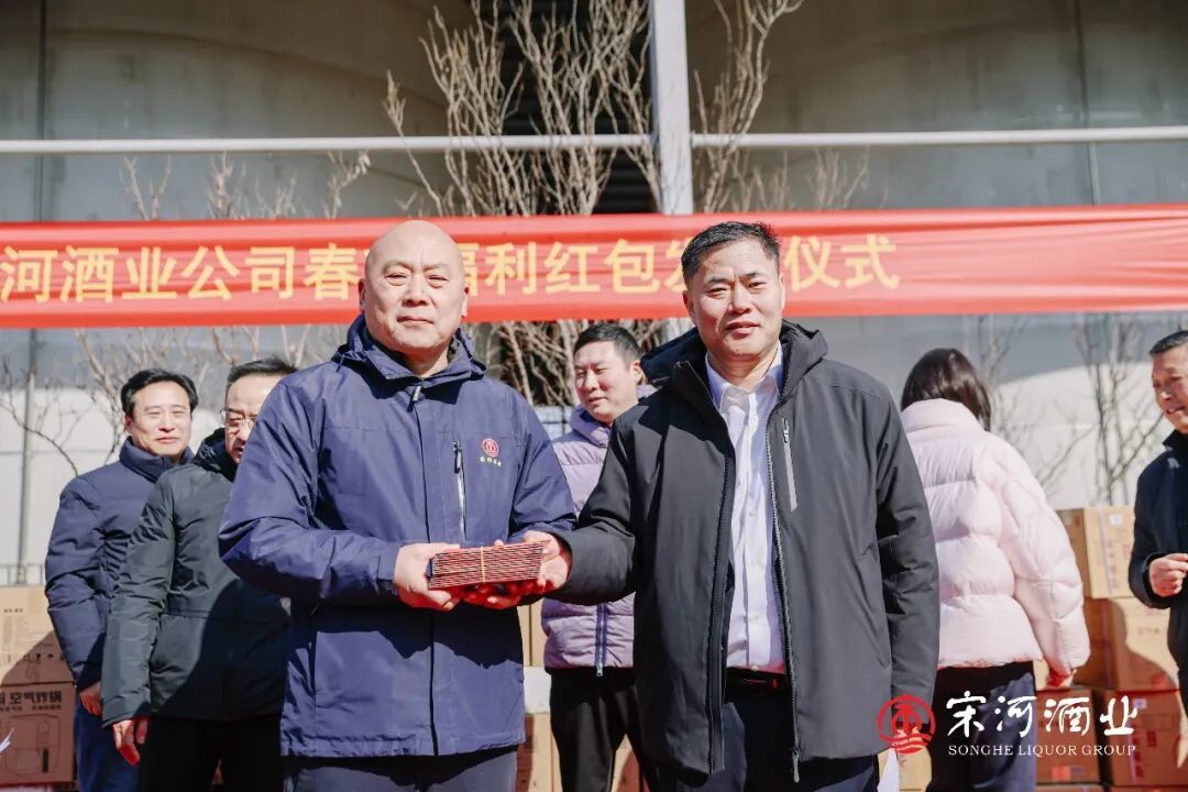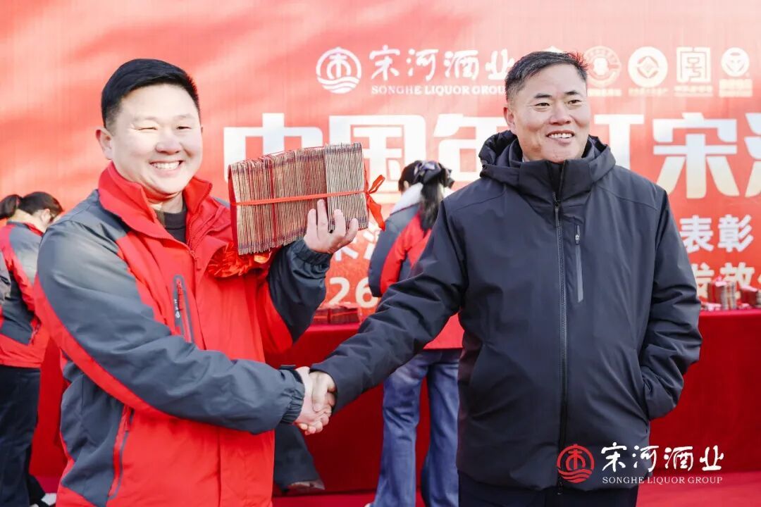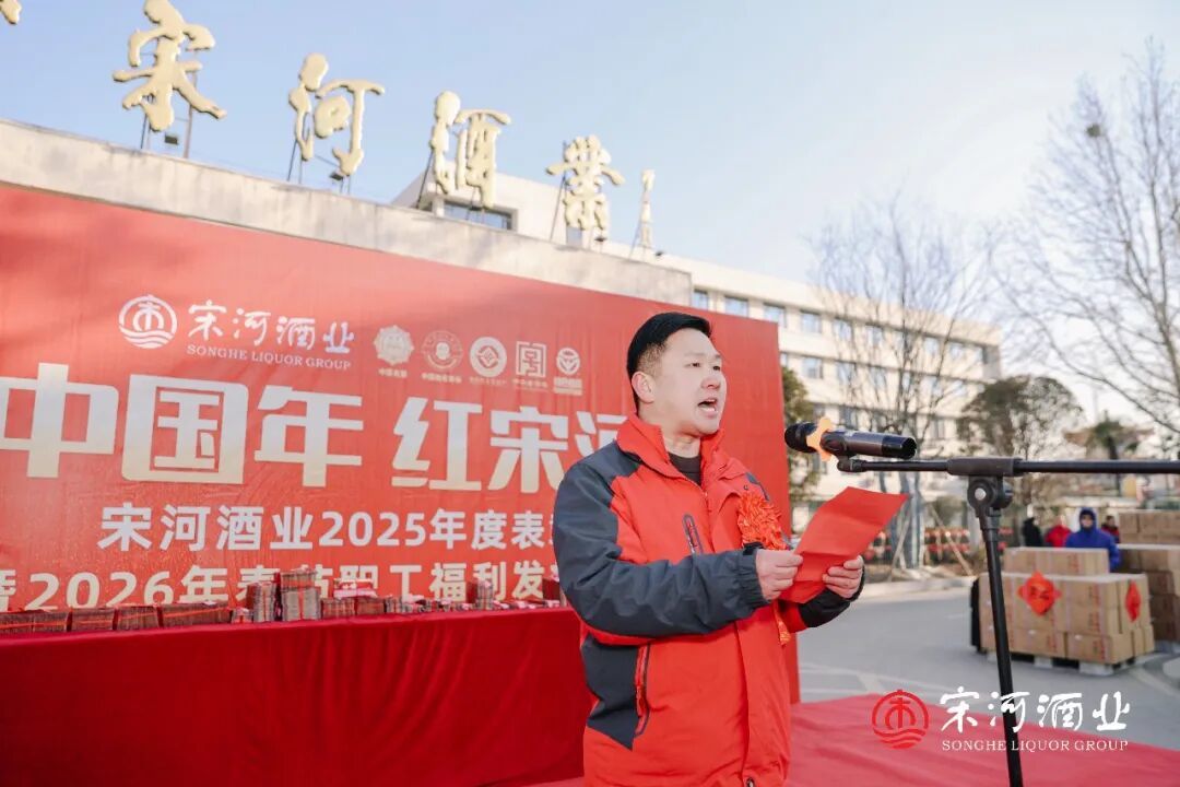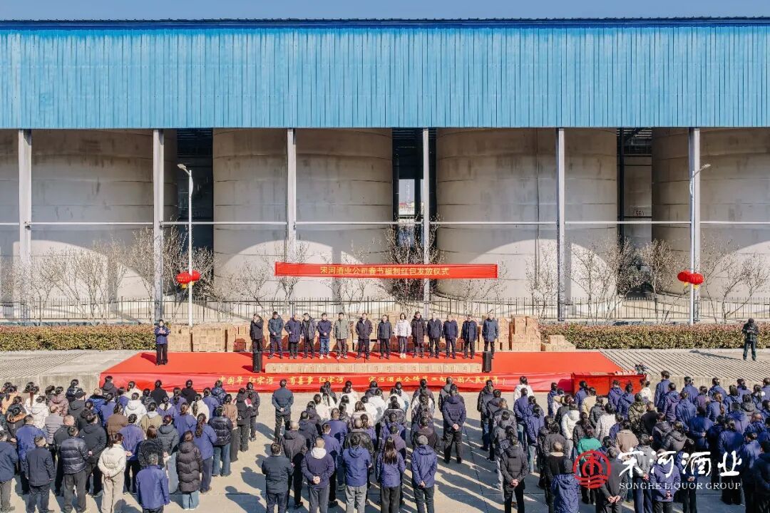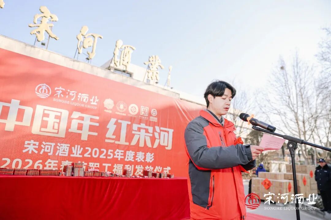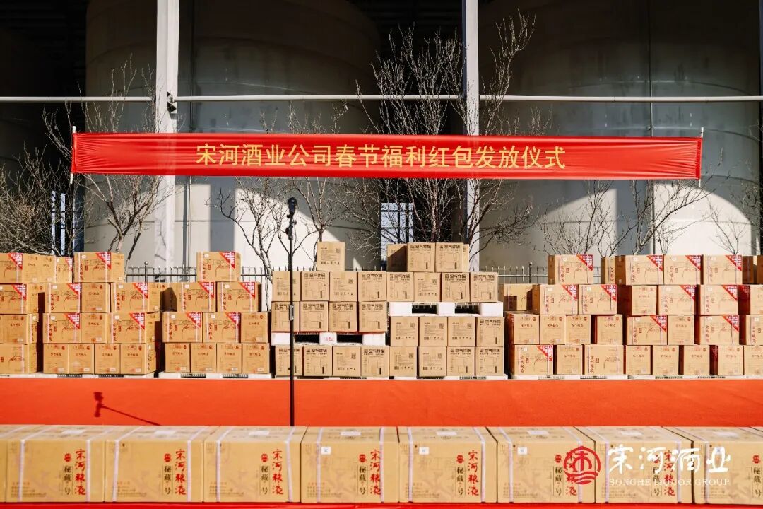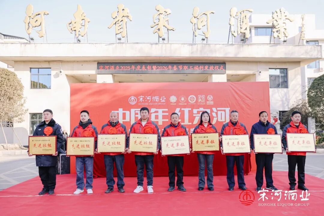 在老子故里鹿邑的宋河酒业生产基地和灌装基地内,“中国年·红宋河——宋河酒业2025年表彰暨2026年职工福利发放仪式”如期举行。2300名宋河员工,连续第3年领到春节慰问金和新春福利。
