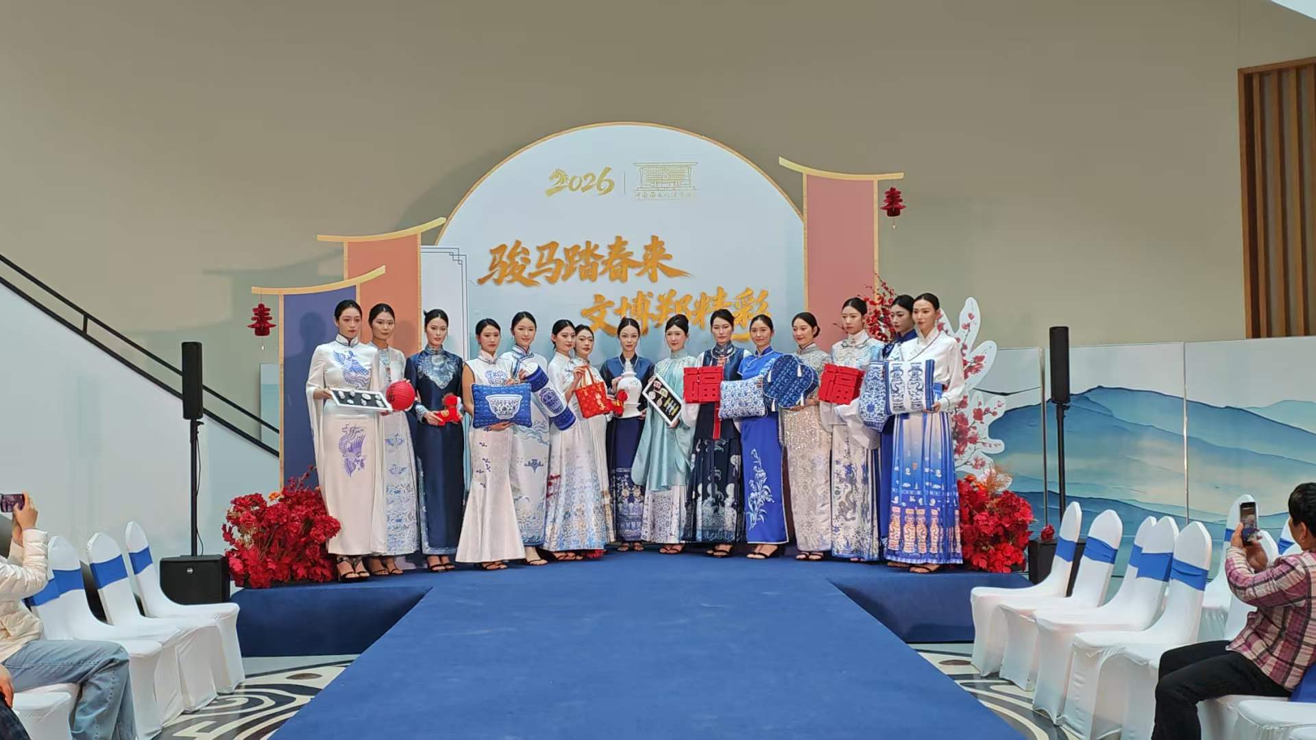 紧接着,一场别开生面的“青花主题精品文创惠民展演”在11时惊艳亮相。此次活动一改传统静态展示模式,创新采用模特走秀的形式,动态呈现了多款融合唐青花纹样、釉色等艺术特征的定制服饰与原创文创产品。模特们身着青花纹样的华服,在馆内优雅穿行,将沉睡于文物的古典美学以鲜活、亲民的姿态带到观众眼前,生动演绎了传统文化的创意转化与活化利用,引来观众阵阵赞叹与拍照留念。