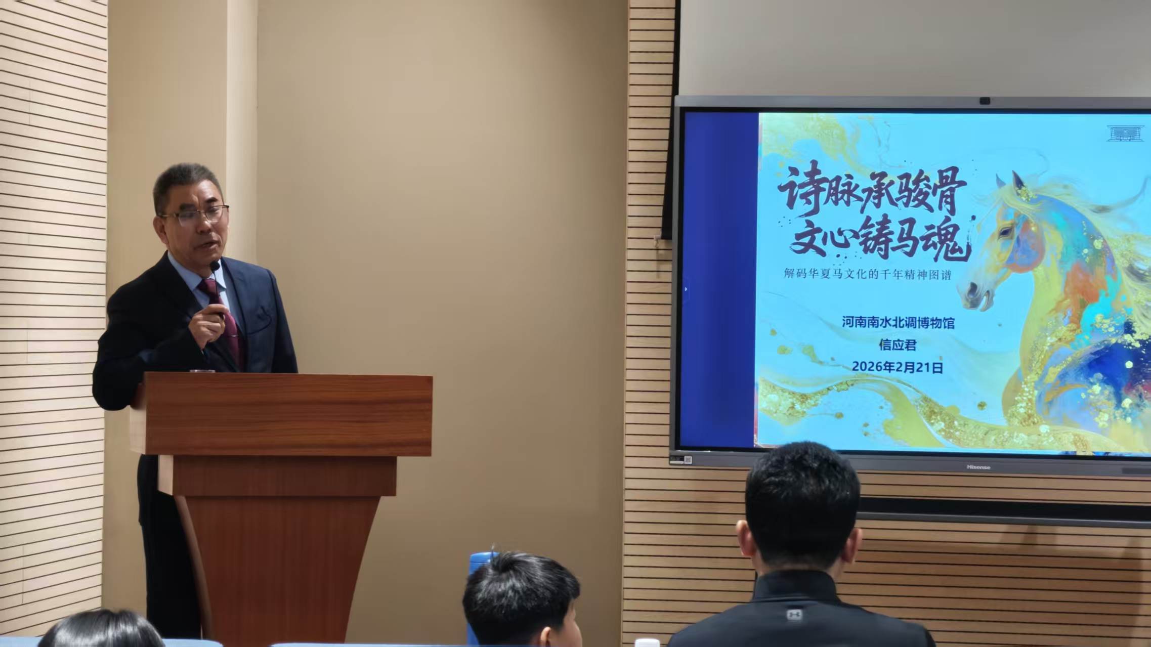 随后,在15时30分,“新年第一课”专场讲座正式开讲。本次讲座由博物馆党支部书记信应君同志亲自主讲,结合精心准备的多媒体课件,以“马”年文化为主题,系统梳理了“马”这一生肖符号在中国历史文化长河中的丰富内涵。从“龙马精神”的奋发进取,到“马到成功”的吉祥寓意,再到文学艺术中马的形象演变,信应君书记通过生动的讲述,引领观众深入理解马所承载的忠诚、勇毅、祥瑞等文化精神,在知识的拓展与历史的回望中,进一步激发观众的文化认同与自信。