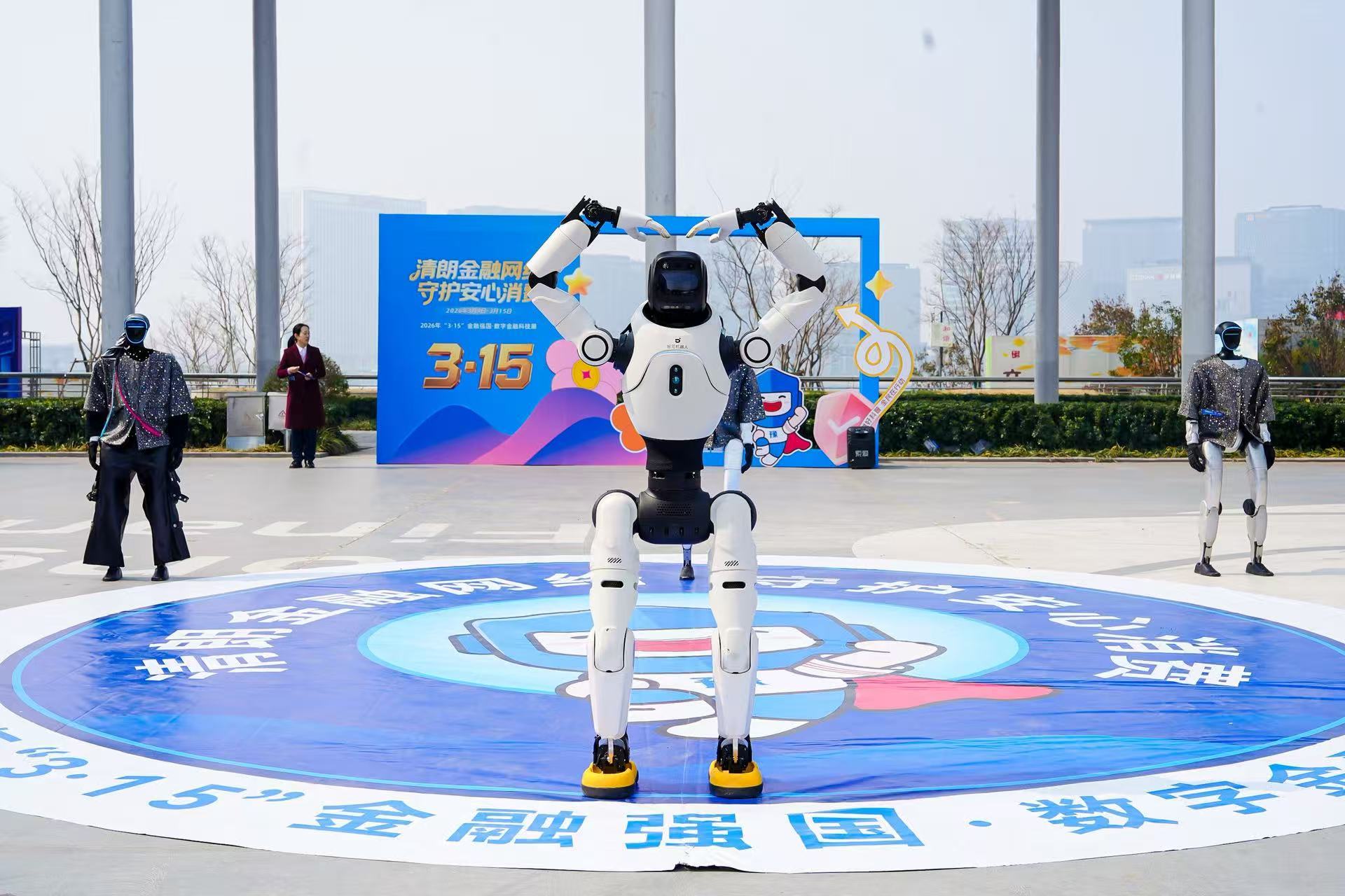 市民纷纷“打卡”,乐享智慧金融新趣。互动体验区向公众全面开放,成为市民感受数字金融的“游乐场”。AI拍照区前排起长队,参观者只需站在镜头前,系统便能精准抓拍、自动生成金融消保主题人物照片;金融机构IP形象墙前,大家积极互动,在欢声笑语中记住“守护钱袋子”的小知识;机器人与IP人偶的即兴共舞,更是将现场气氛推向高潮,参观人员纷纷举起手机记录这科技与萌趣交织的一刻。
