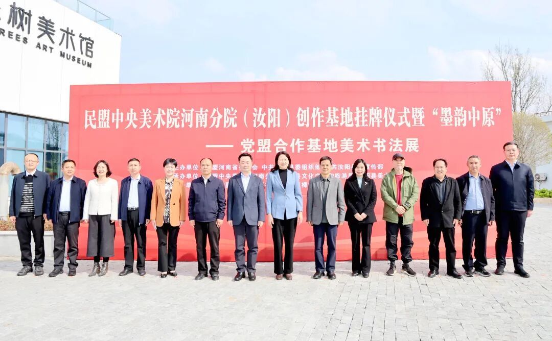 在汝阳县五棵树美术馆,霍金花、夏许峰、赵红艺、李健强共同为民盟中央美术院河南分院(汝阳)创作基地揭牌,霍金花宣布“墨韵中原”——党盟合作实践基地美术书法展开幕。