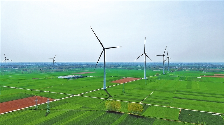 4月4日,临颍县繁城镇广阔平原上,数十台风机巍然矗立。风机之下,麦田碧波起伏,绘就乡村振兴的壮美生态画卷。记者 聂冬晗 摄